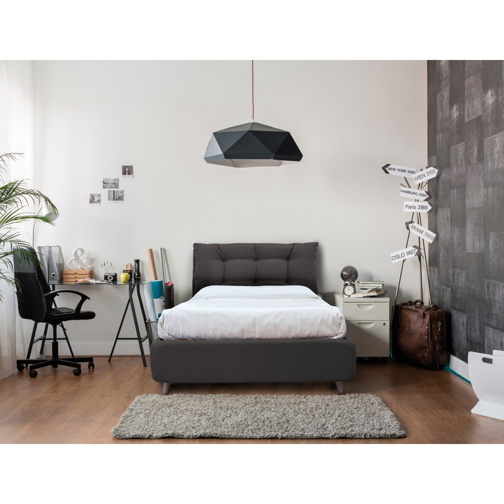 Model med standard beholder : polstret sengeramme med understøttet bund inkluderet og behagelig 11 cm høj fod, som tillader rengøring under strukturen. Beholder med skrå åbning, som tilføjer det praktiske af et stort rum med utrolig kapacitet.