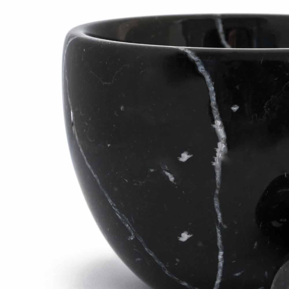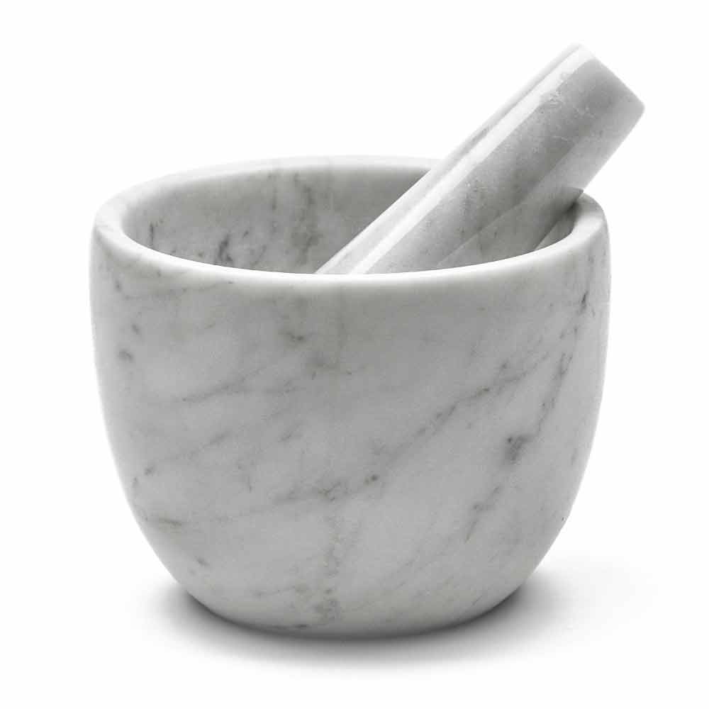 Lille mørtel med pistil udelukkende lavet af hvid Carrara-marmor i høj kvalitet. Det er et unikt stykke, da hver brugt marmorblok adskiller sig fra de andre for vener og nuancer.