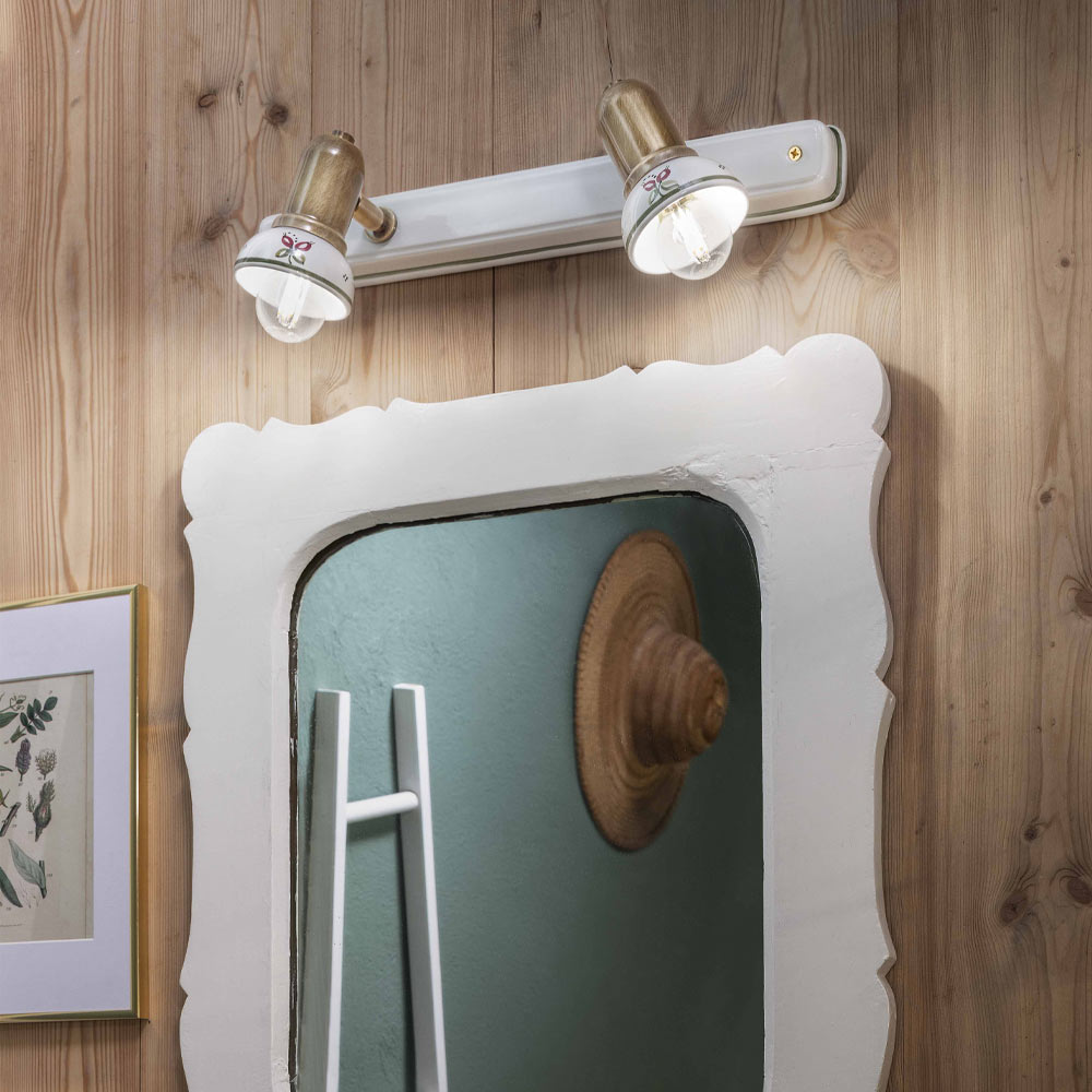 Lineær væglampe 2 lys i messing og håndmalet keramik, lavet i Italien af Ferroluce.