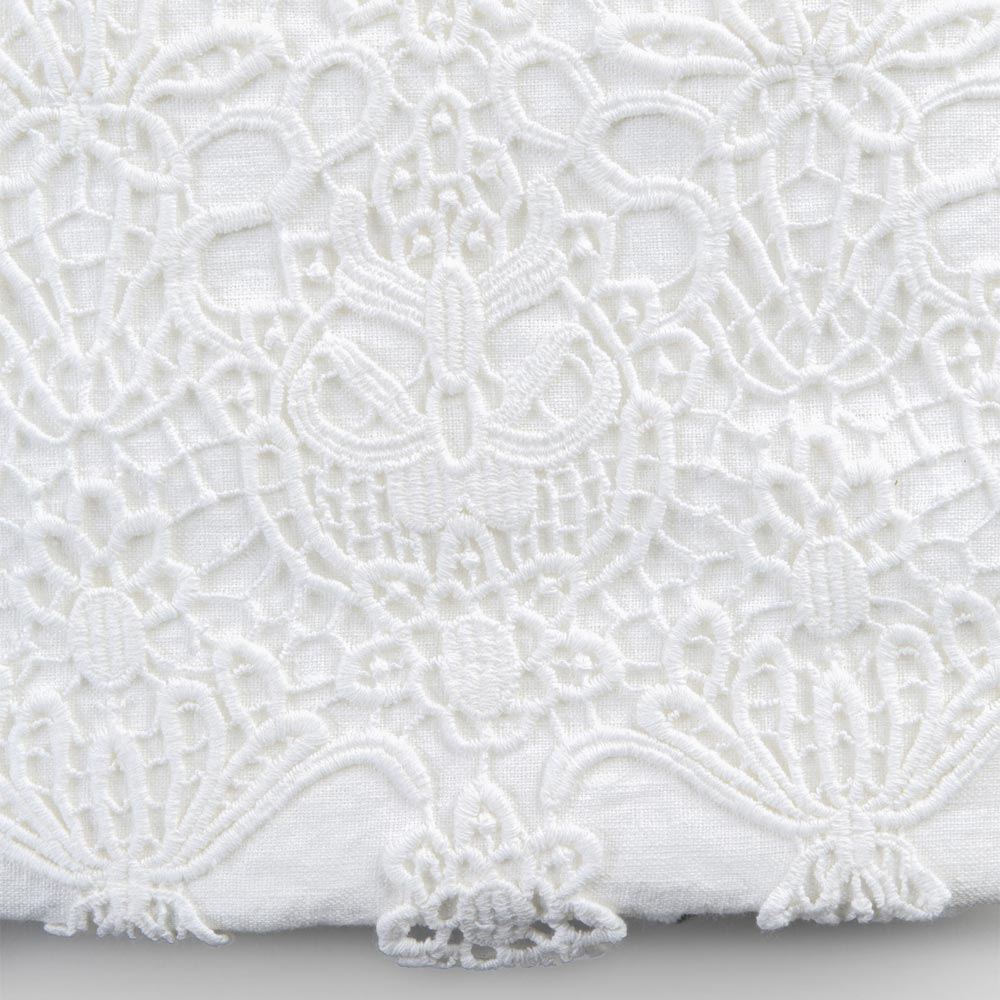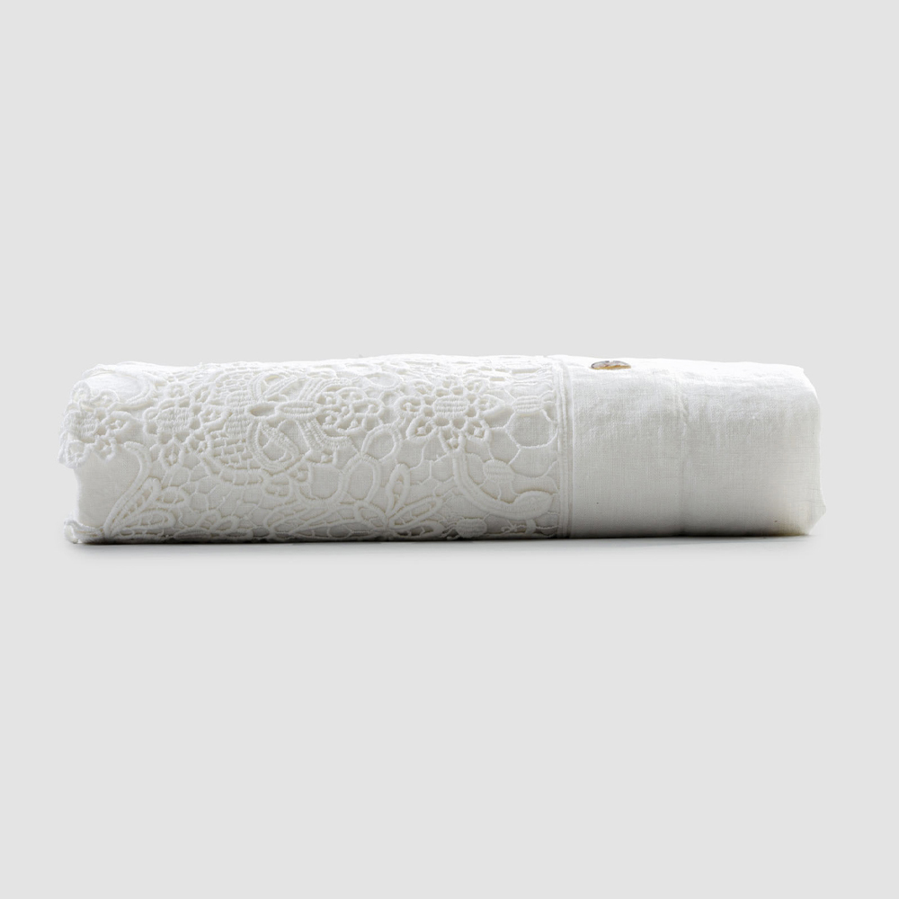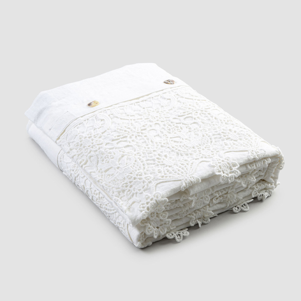 Dobbelt dynebetræk i hvidt linned med blondedråber, håndlavet luksusdesign lavet i Italien.