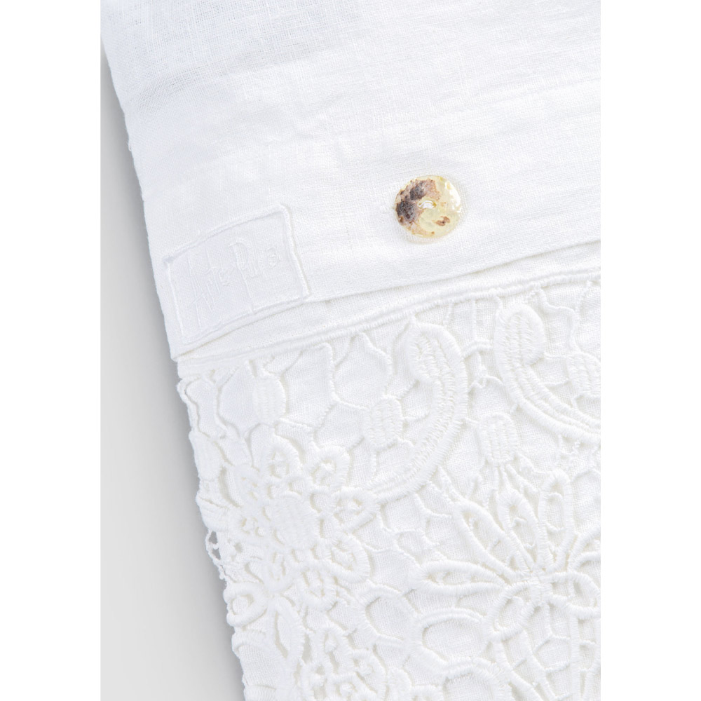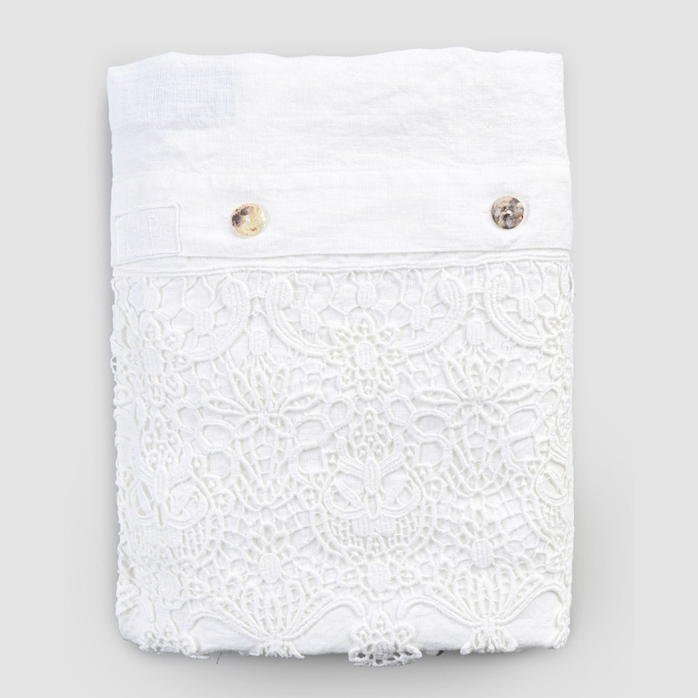 Værdien af tradition forbinder moderne livsstil med denne tunge hvid linned container sæk udsmykket med dråbe blonder og Agoya mor-of-perle knapper.
