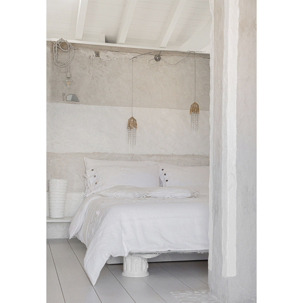 Gennem opmærksomhed på detaljer og et ægte design, der peger på essensen af skønhed, fødes der således et autentisk og håndværksmæssigt produkt af højeste kvalitet for de valgte råvarer, såsom det reneste linned og den blødeste bomuld. Materialets naturlige ufuldkommenhed betegner således værdien af enkelhed , omgivet af et elegant og delikat håndværk til en sublim og suggestiv sensorisk oplevelse
