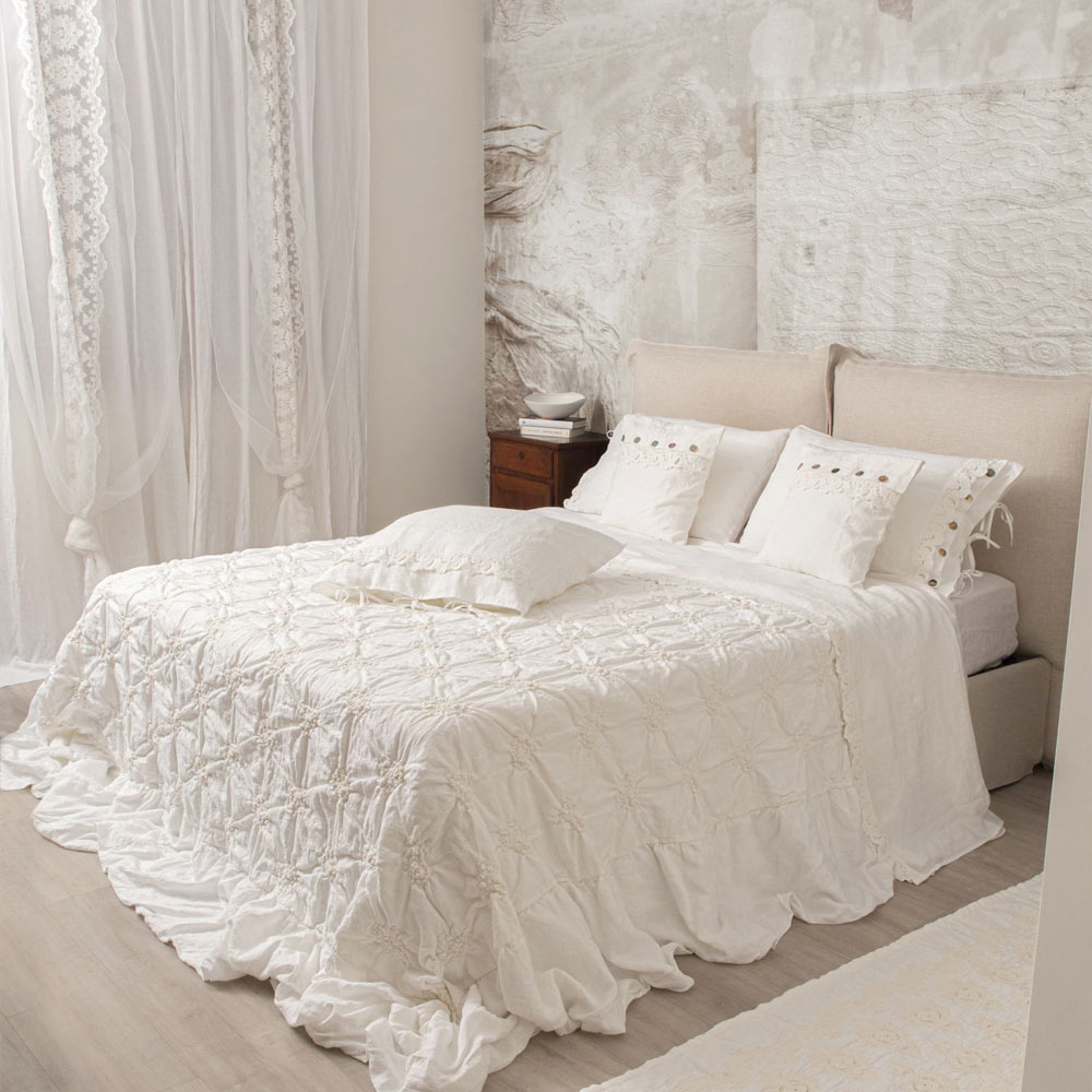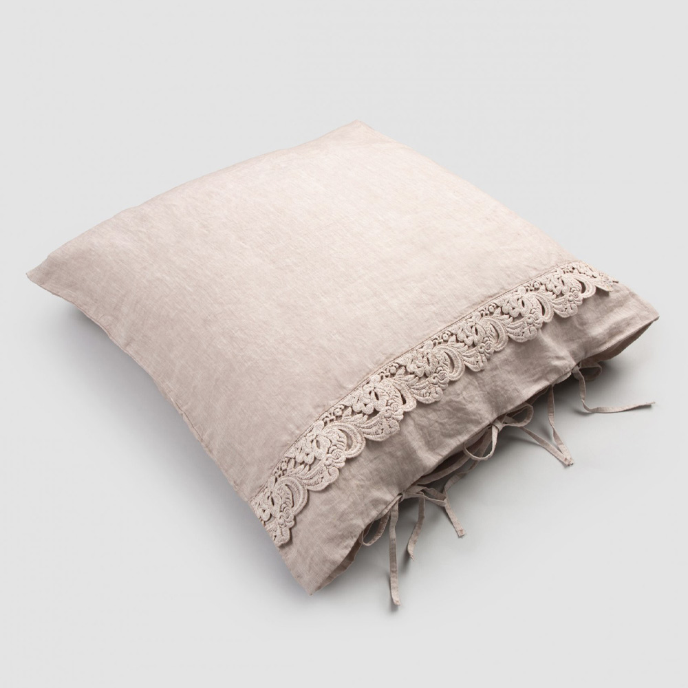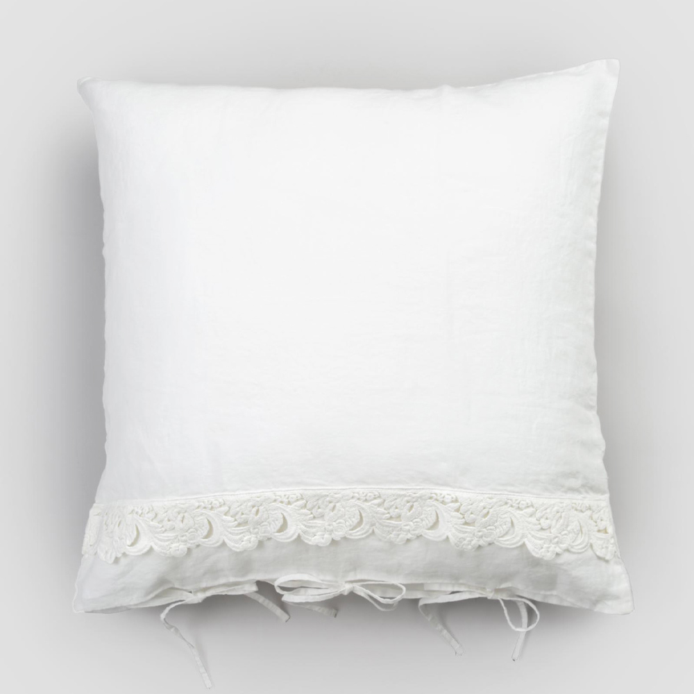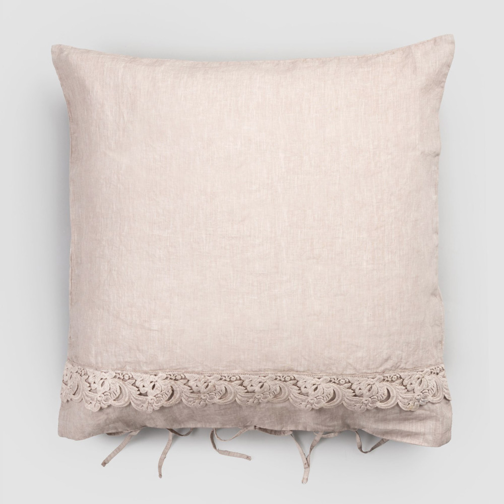 Firkantet pudebetræk i rent linned med harmoniblonder og knapper med snørebånd, 2 farver fremstillet i Italien.