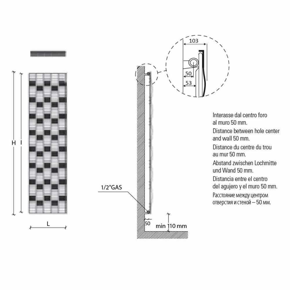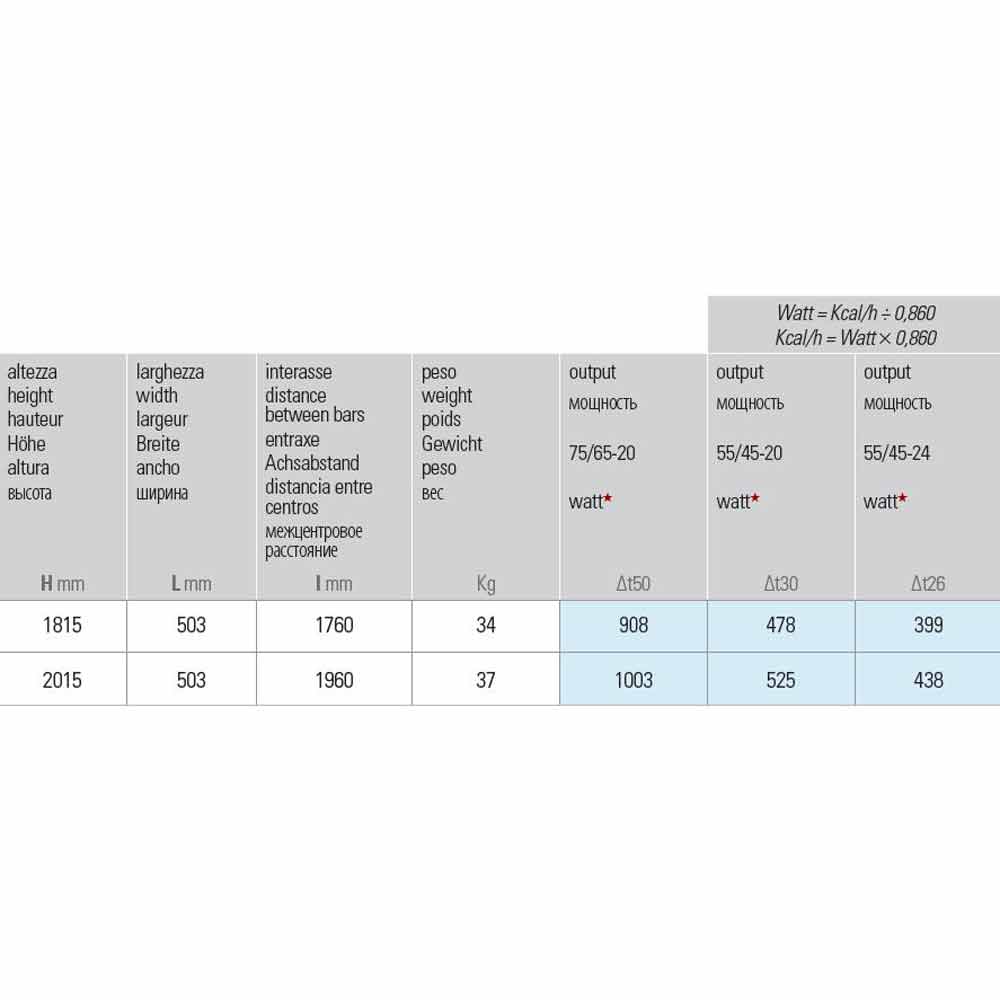 Fås i forskellige størrelser med 5 bjælker *:- H 1815 x L 503 x Inter. 1760 mm x Output w (Δt50 *) 908; Udbytte w (At30 *) 478; Udbytte w (At26 *) 399