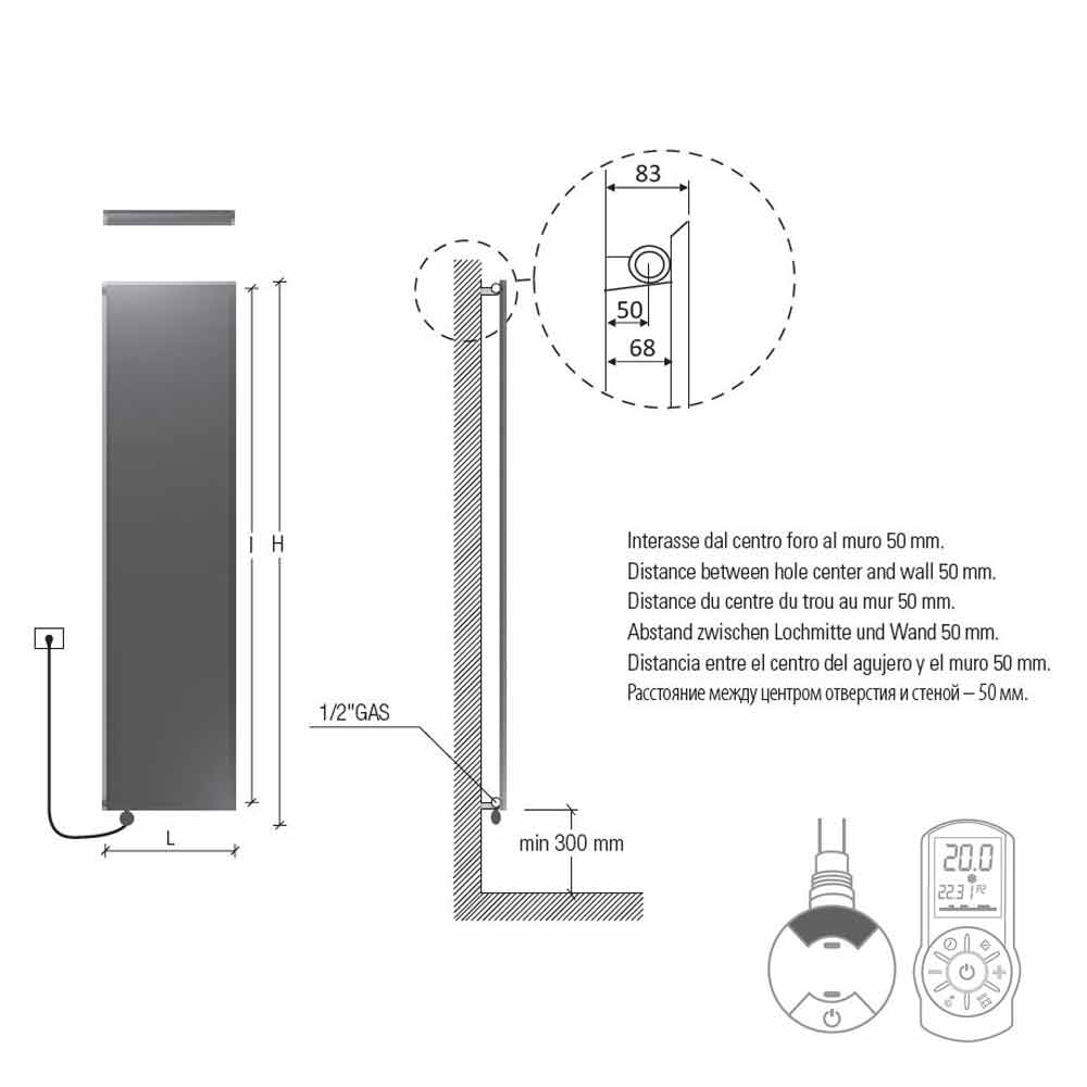 Lodret elektrisk vægmonteret radiator i moderne design i skifergråt stål fremstillet i Italien.