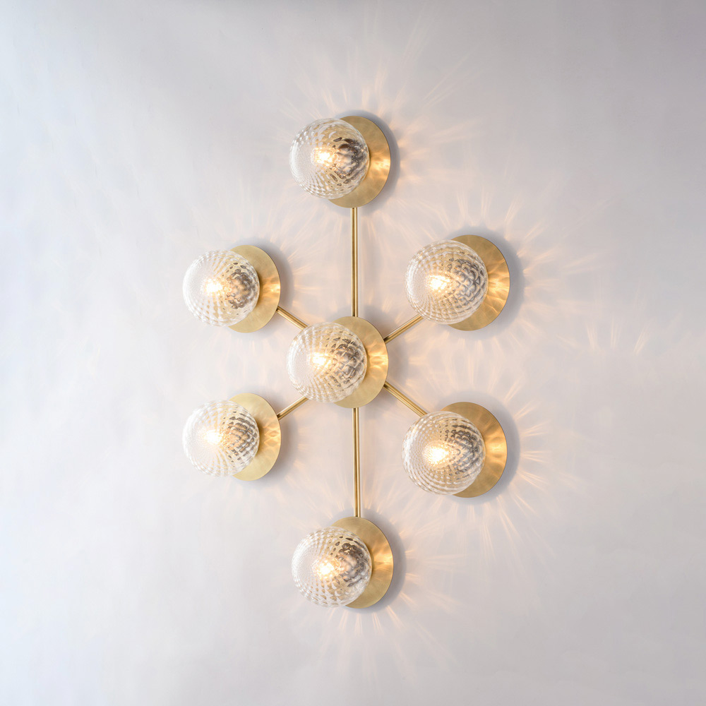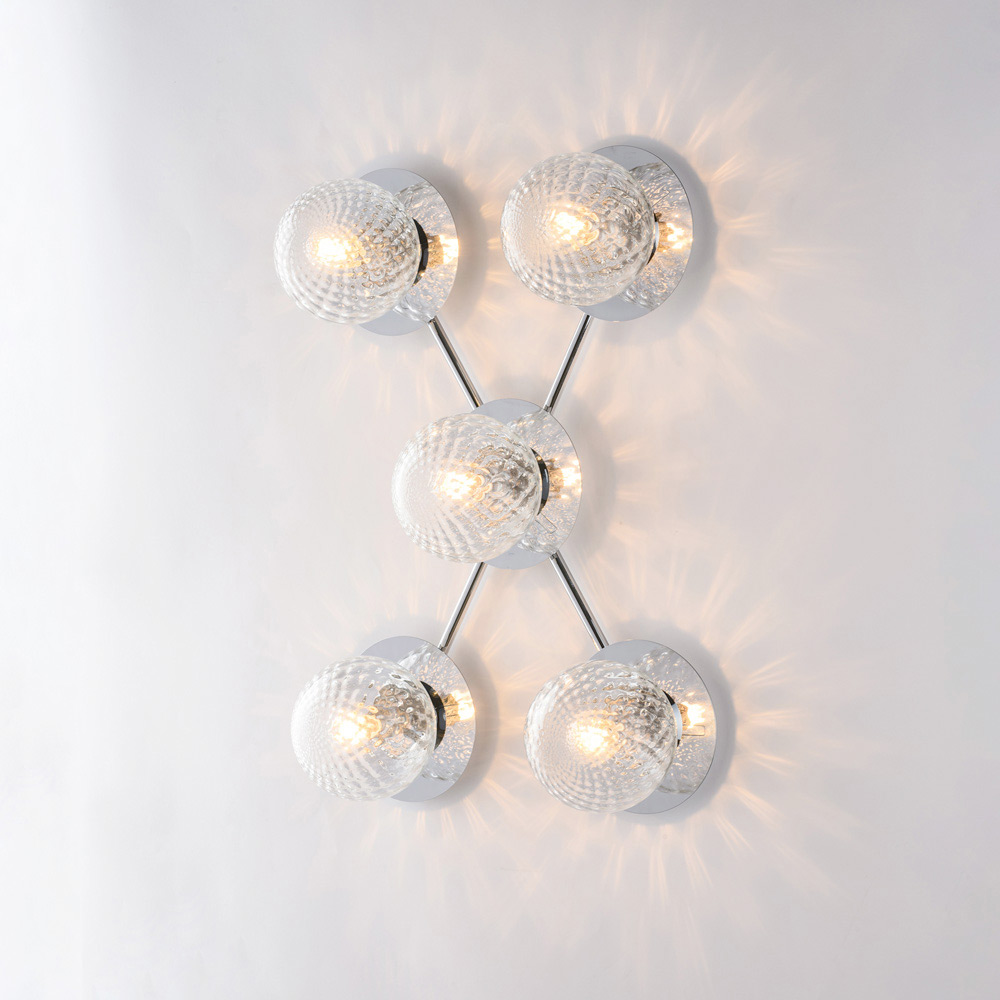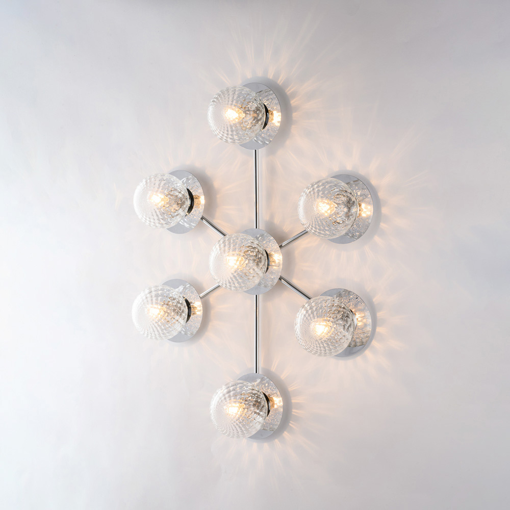 Denne håndlavede loftlampe i jern er dramatisk og moderne og skiller sig ud med sin dynamiske og moderne komposition. Den forgrenede struktur huser sfæriske glasdiffusorer, arrangeret i et afbalanceret mønster, hvilket skaber et suggestivt spil af lys og refleksioner, der fremhæver loftet og oplyser rummet ensartet.