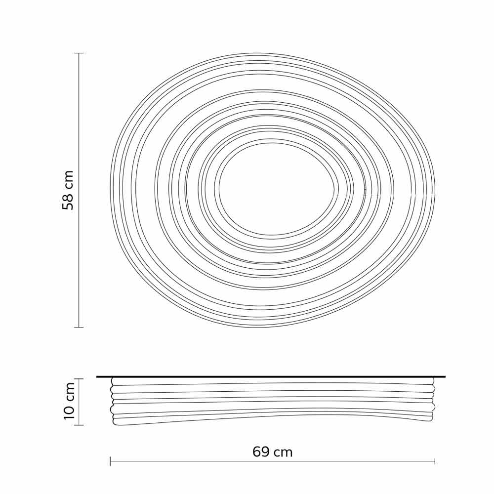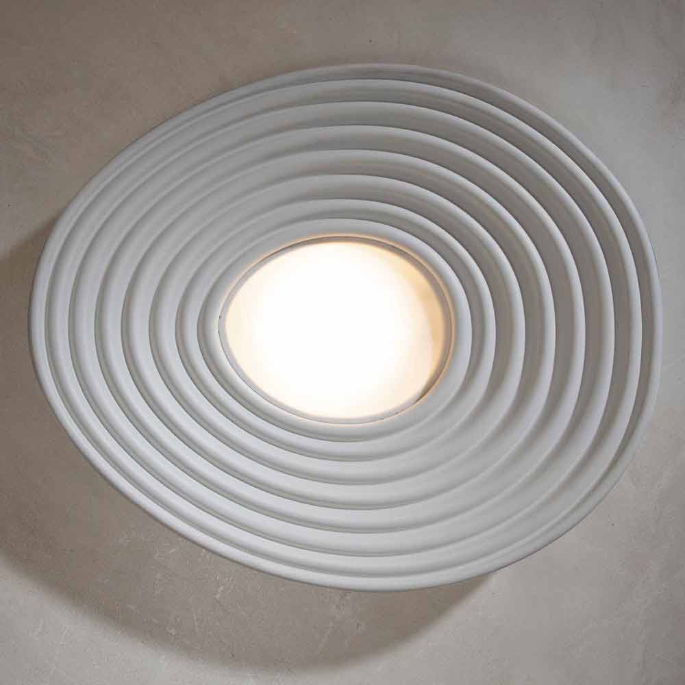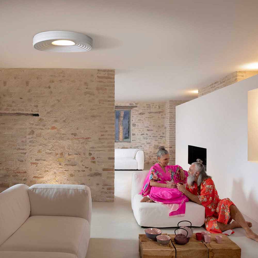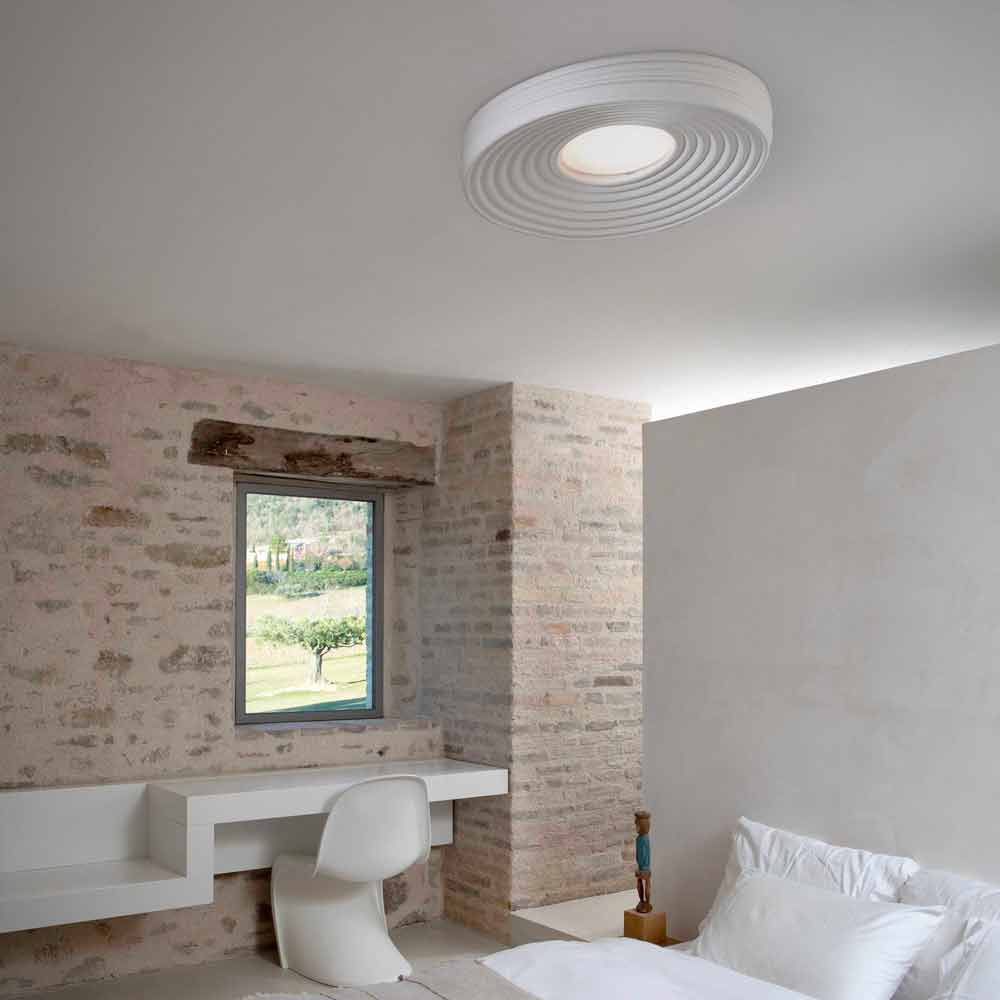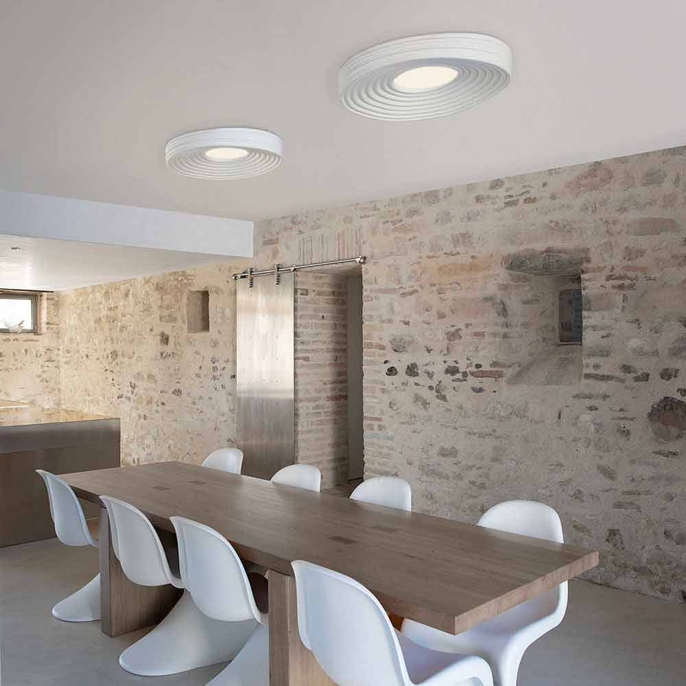 Denne originale og entydige loftslampe skaber vidunderlige legespil takket være den centrale del, der garanterer direkte belysning, og som spreder sig på overfladen af lampen og reflekterer sig selv i koncentriske cirkler.