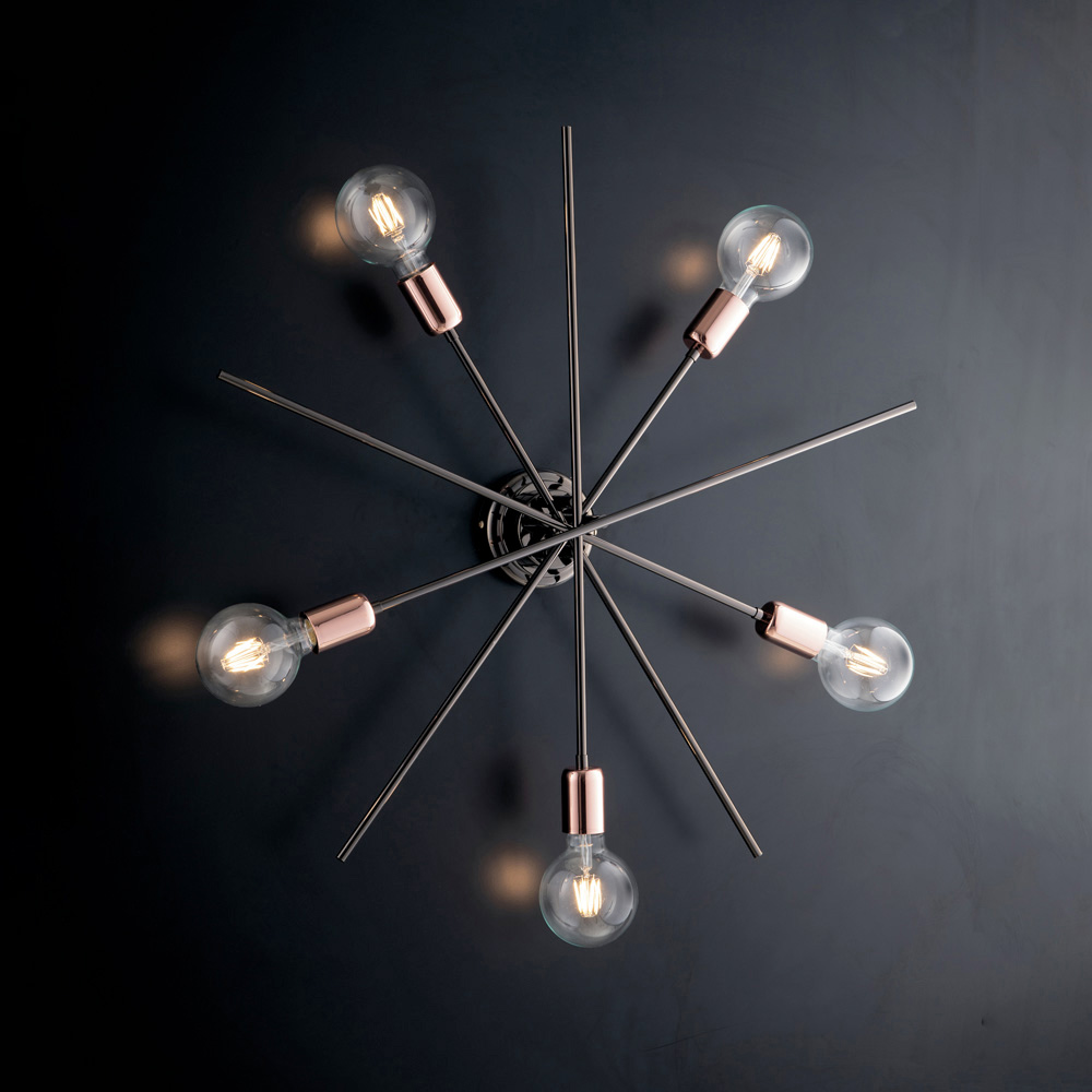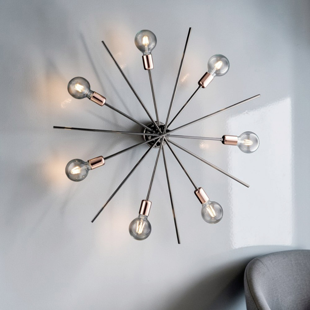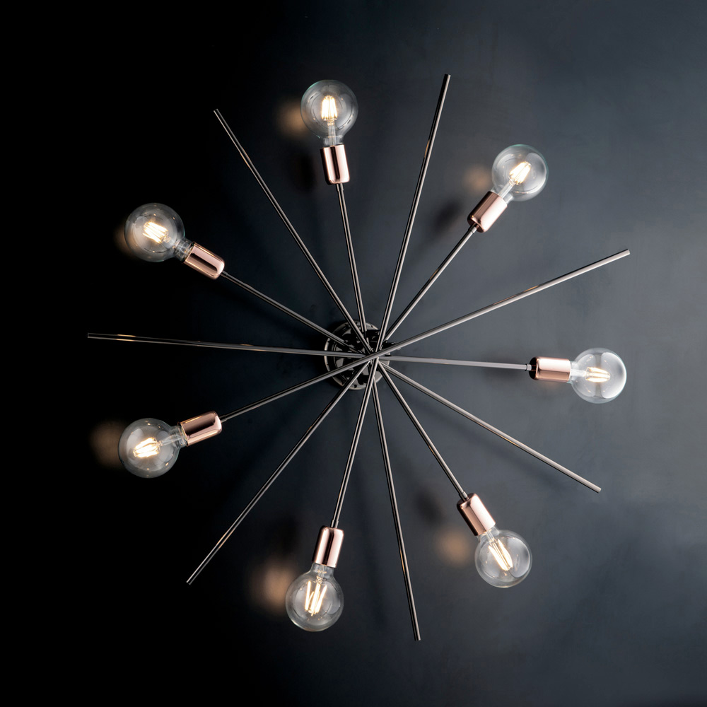 Denne ikoniske og visuelt slående loftlampe i sort krom og kobberjern er en moderne og sofistikeret kreation. Den radiale struktur, inspireret af mid-century og moderne industriel stil, udfolder sig i en dynamisk komposition af metalarme, der spreder lyset jævnt og dramatisk.