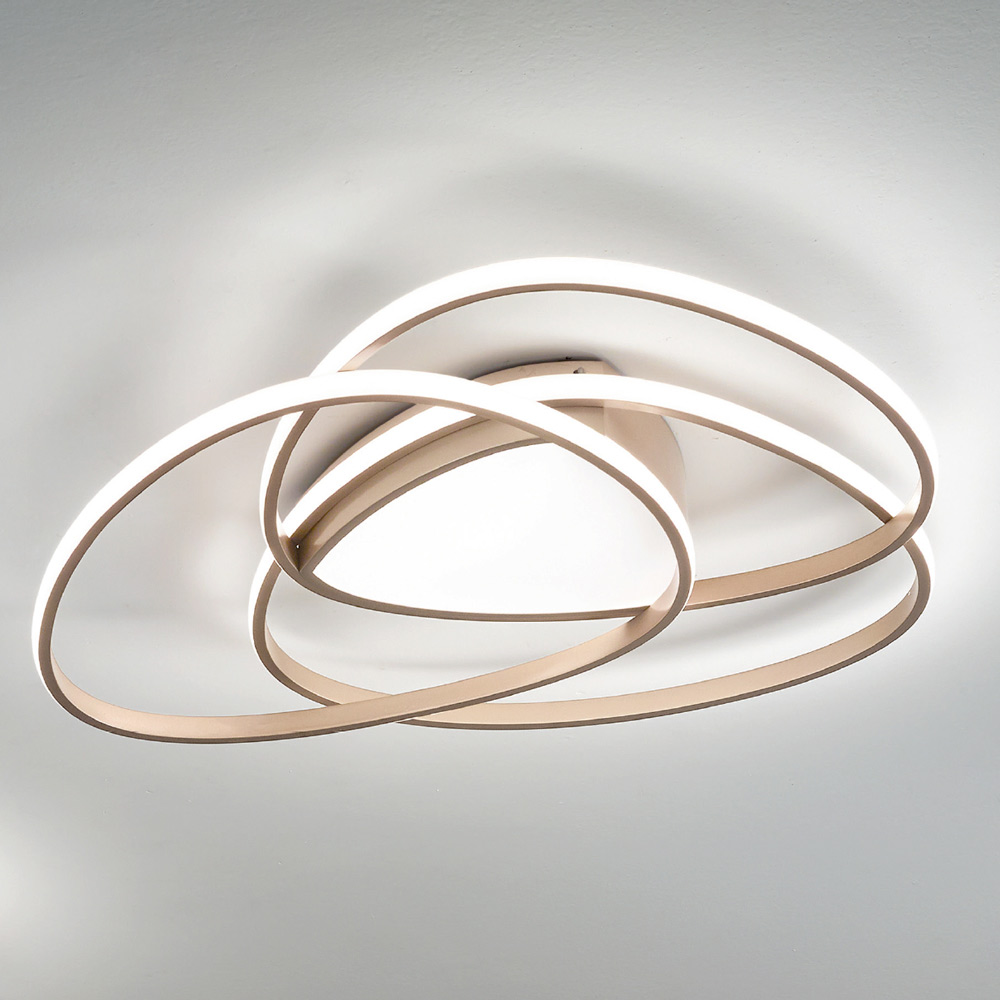 Moderne dæmpbar LED loftslampe med metalstruktur.