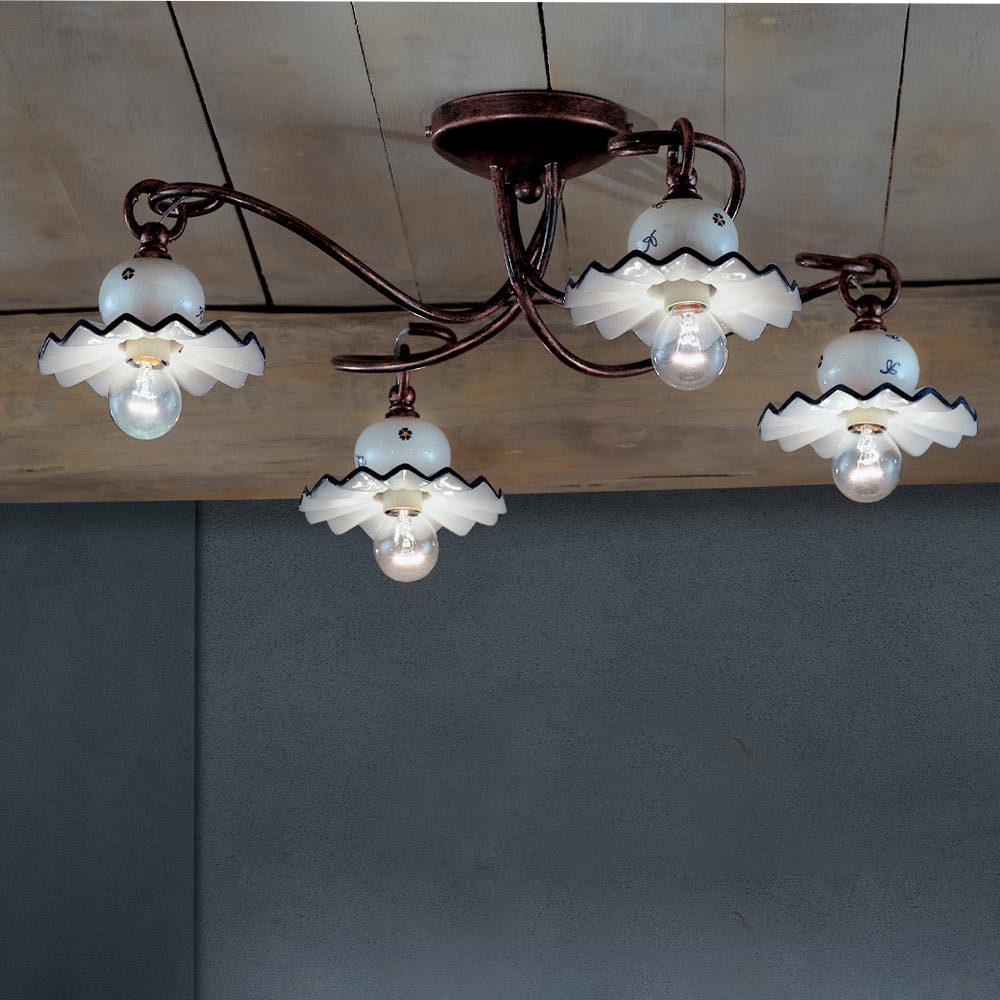 Håndlavet 3 eller 4 lys loftslampe i metal og håndmalet keramik lavet i Italien af Ferroluce.