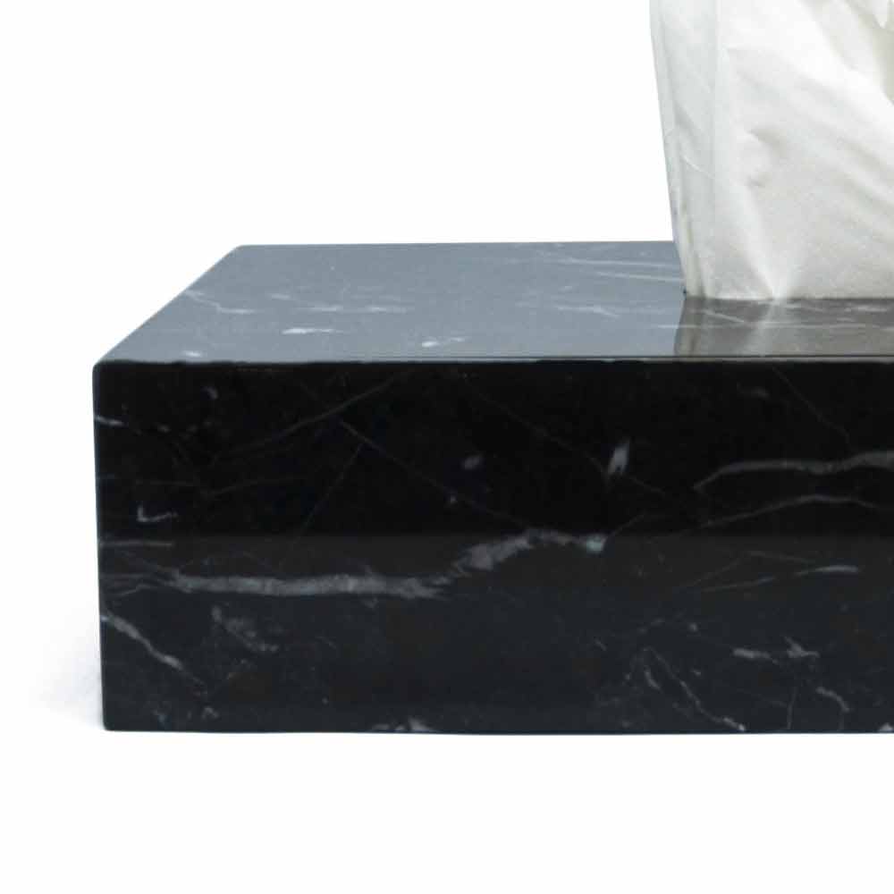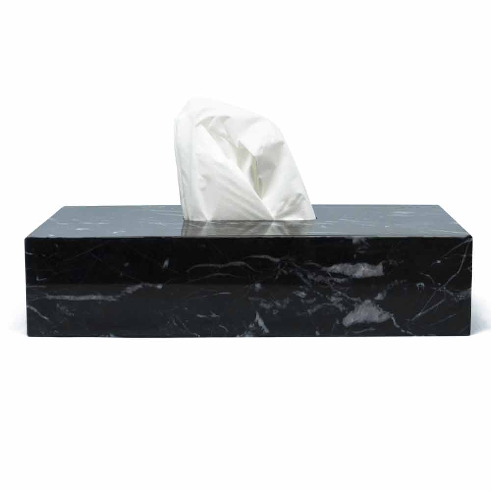 Praktisk væv indehaveren containerne indtil rektangulære udgave udelukkende er fremstillet af sort Marquinia marmor håndlavede af specialiserede fagfolk. Det er et unikt stykke, da hver brugt marmorblok adskiller sig fra de andre med hensyn til vener og nuancer.