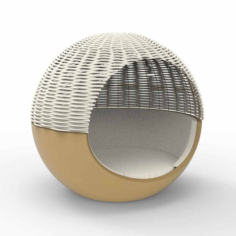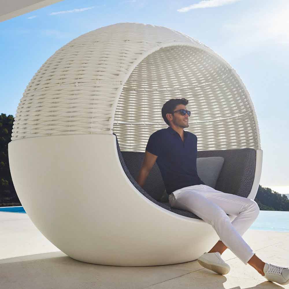 Rund dagseng til udendørs med et luksuriøst roterende design i polyethylen og parasol i vævet reb, forskellige farver.