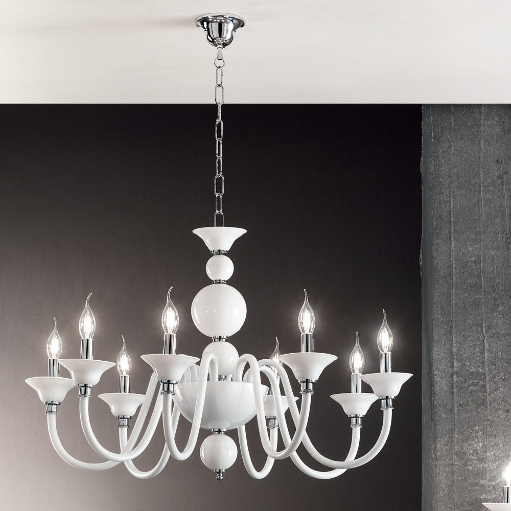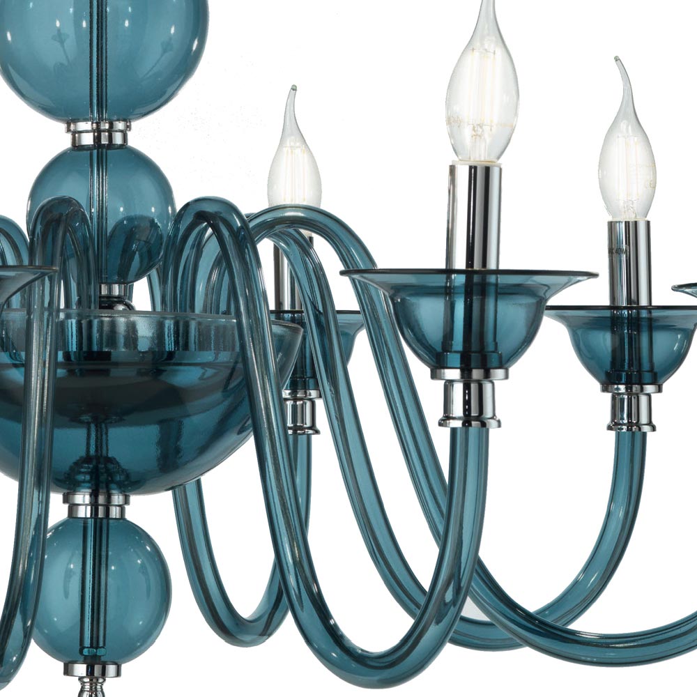 Klassisk 8-lys lysekrone i krommetal og håndlavet glas, luksus fremstillet i Italien.
