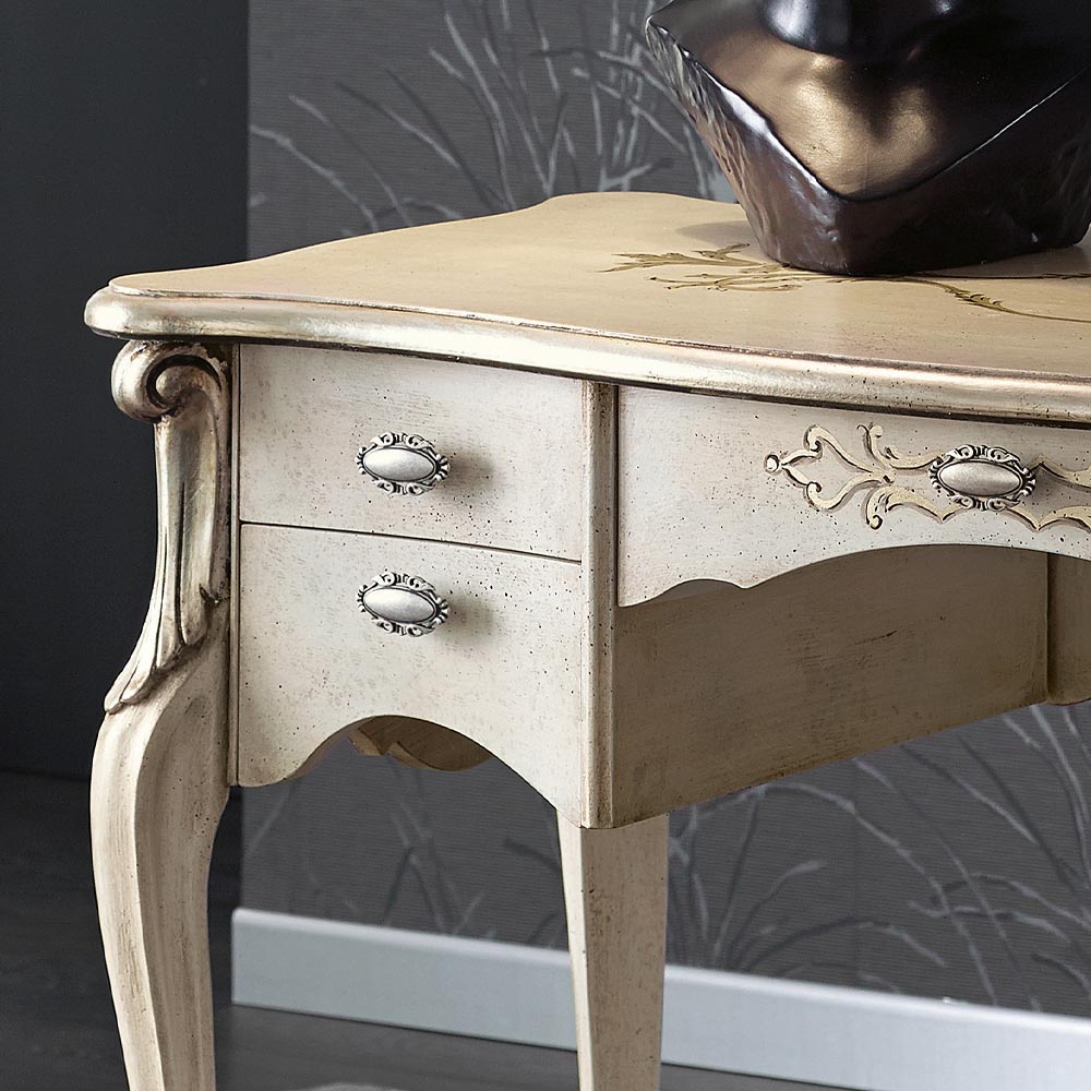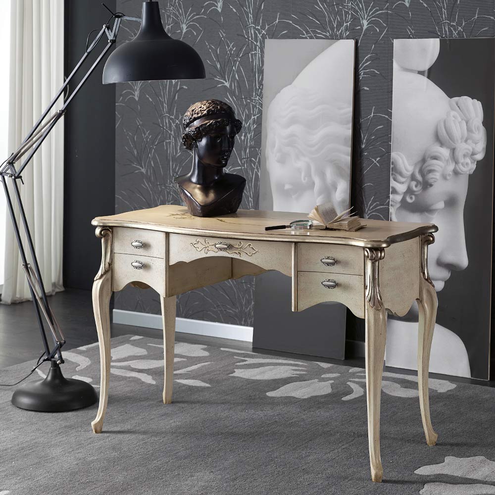 skrivebord i klassisk stil er perfekt til at dekorere en stue, arbejdsværelse eller soveværelse med stil og elegance. Den er lavet af træ i Bassano valnød eller antik hvid finish og har 5 praktiske skuffer. Det er også muligt at vælge mellem versionen med lågen, der kan åbnes til højre eller venstre.