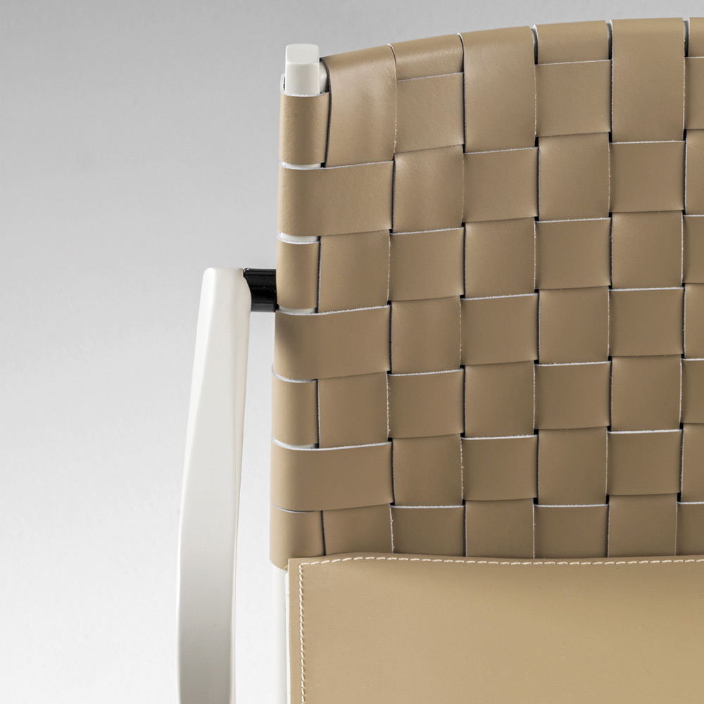 Moderne stol med armlæn fremstillet i Italien med beige lakeret struktur af bøg og læderyg og sæde. Et design, der tager sit kue fra traditionelle stilarter, der er revideret i en moderne nøgle for at skabe et supplement, der forener en funktionel side og en rent dekorativ side, der er i stand til at karakterisere og gøre møblerne i ethvert moderne miljø unikt. Det, der beriger æstetikken, er bagsiden i vævet læder, der øger produktets originalitet, og som takket være det tilgængelige udvalg af farver svarer til ethvert stilbehov og formår at skabe en unik harmoni mellem alt tilbehør. til stede.