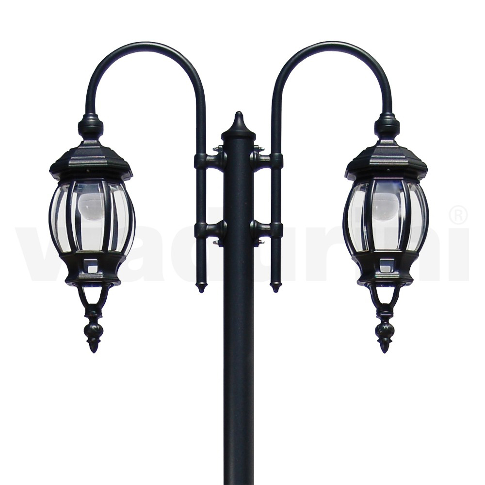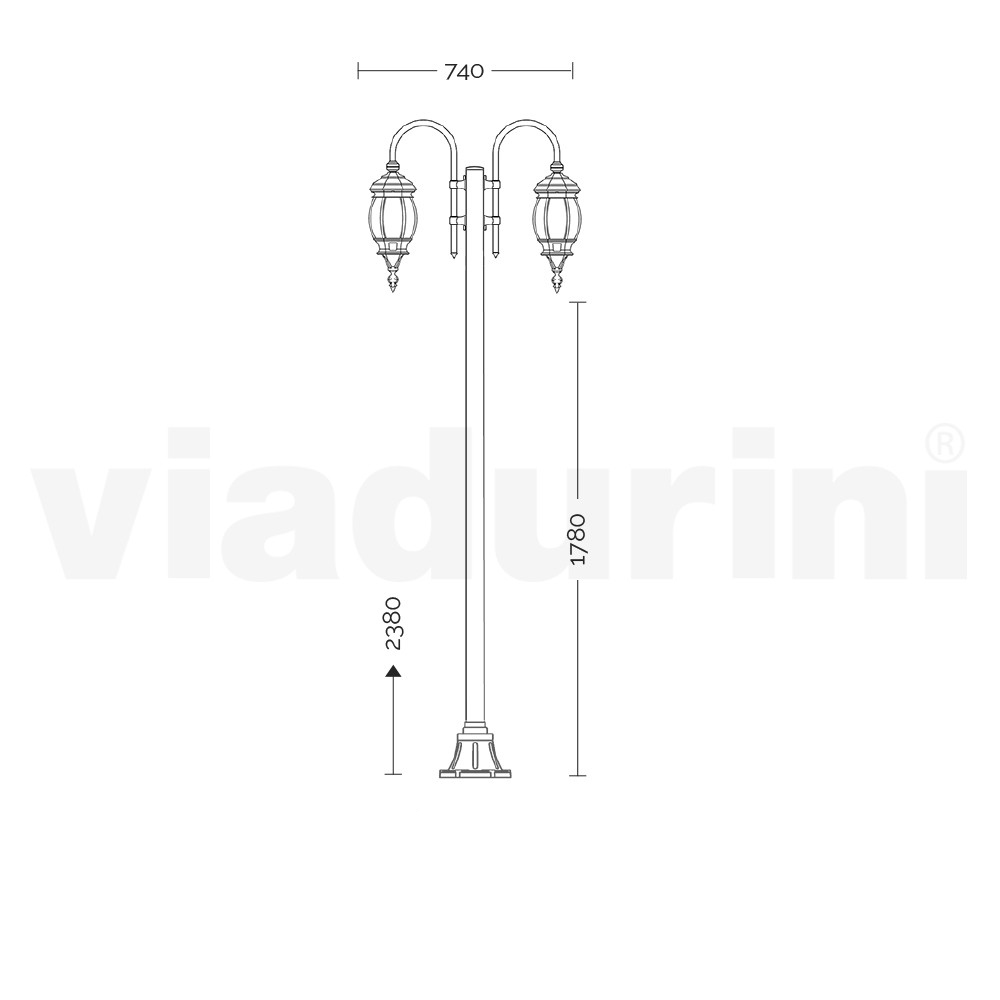 2-lys havelampe lavet gennem 100% Made in Italy produktion i trykstøbt aluminium i antracitgrå finish med transparent polycarbonat diffuser. Komplet med rustfri stålskruer. Et indretningstilbehør til udendørsrum med en stærk vintage-personlighed og en romantisk stil præget af vidunderlige raffinerede og omhyggeligt udformede detaljer, som understreger dens elegance. Ideel til udendørs miljøer såsom haver, alléer, gangbroer eller udendørs kontraktrum såsom barer og restauranter.
