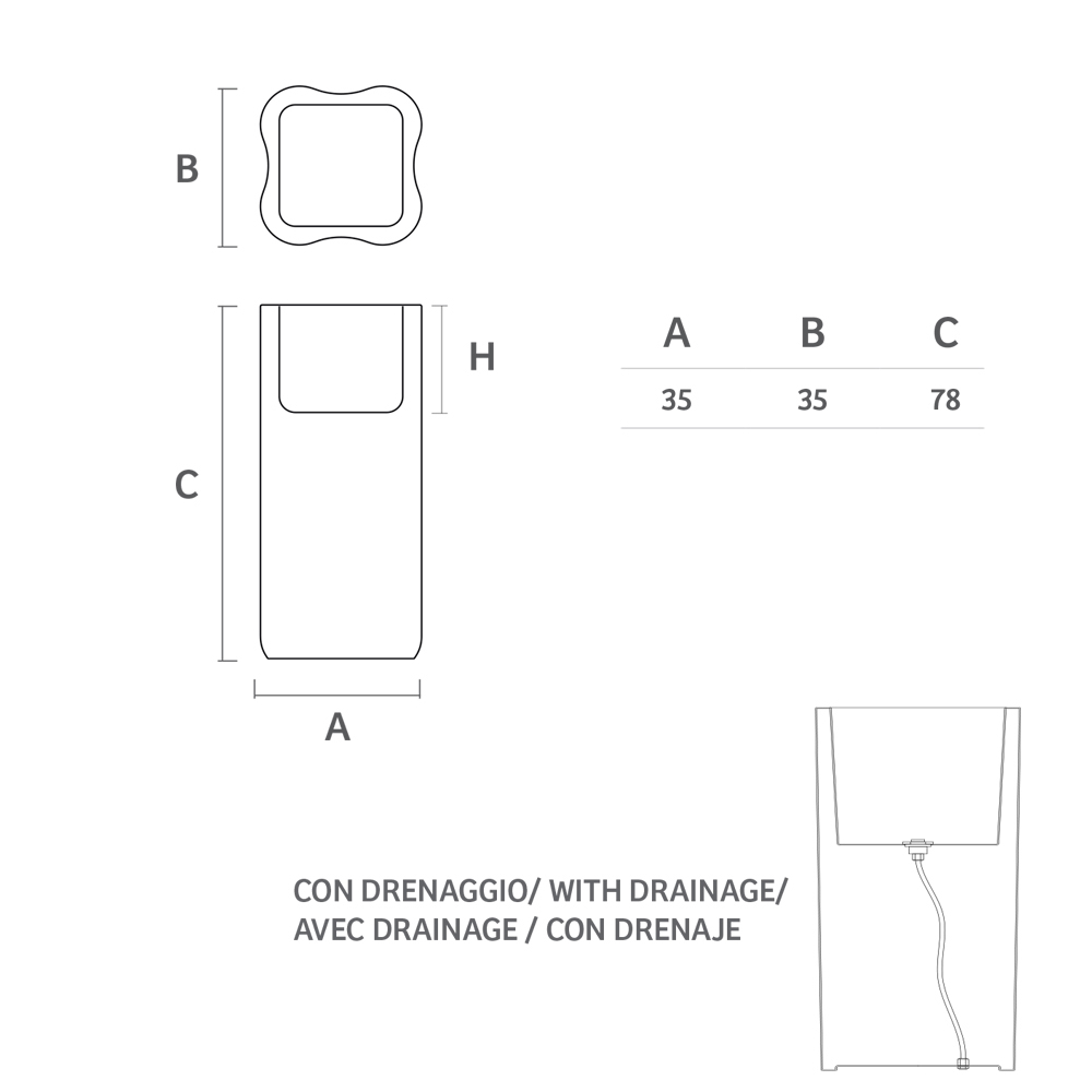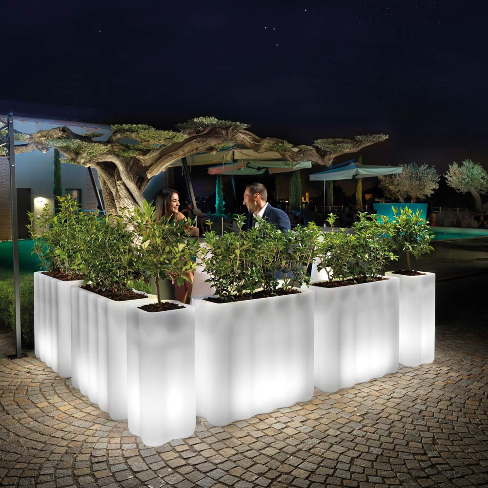 Den lysende udendørs vase i perlepolyethylen fremstillet i Italien . Det integrerede LED-lys forvandler denne udendørs vase til et indretningstilbehør med bløde og snoede linjer, der afspejler en idé om klassisk, men utrolig elegant stil. Strukturen inkluderer også et vandafløbssæt for at udnytte den maksimale praktiske og funktionalitet af dette produkt uden at forsømme det endelige resultat, en elegant og suggestiv lys atmosfære.