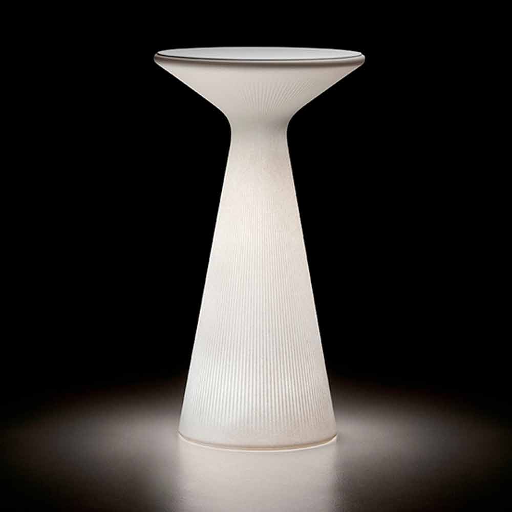 Rundt udendørs sofabord fremstillet i Italien med polyethylenstruktur og hvid HPL-top. Enkelhed og funktionalitet skelner mellem dette moderne høje bord, ideelt til brug som en praktisk støtteflade, men samtidig i stand til at spille en rent dekorativ rolle takket være dets innovative og originale design. Den særlige stribede overflade, der dækker hele produktets bund, gør sofabordets æstetik interessant, beriget af RGB LED-lyset, der belyser strukturen og giver liv til ideelle atmosfærer til at tilbringe vidunderlige aftener i selskab i hjemmet som haver og terrasser, men også i kontraktmiljøer, hvor det er nødvendigt at finde en møbleløsning, der er så funktionel som den er æstetisk tiltalende.