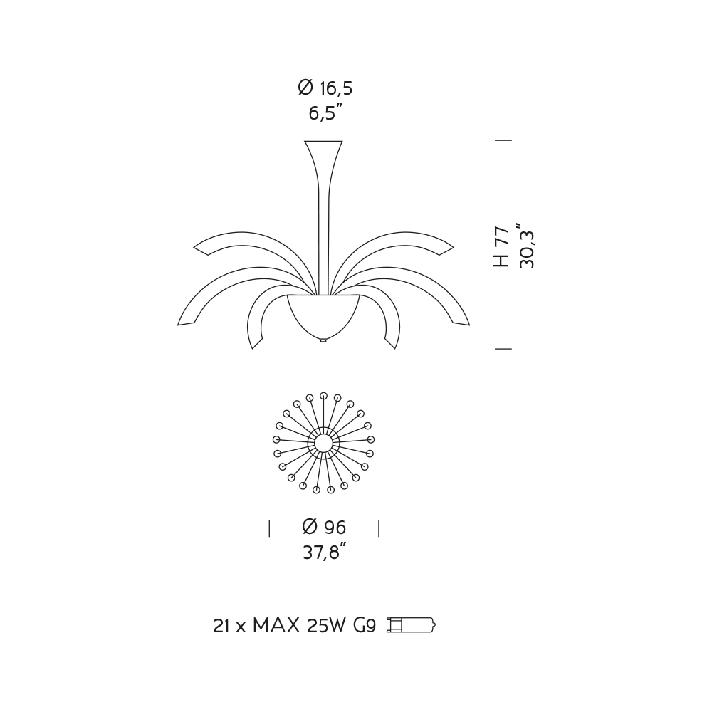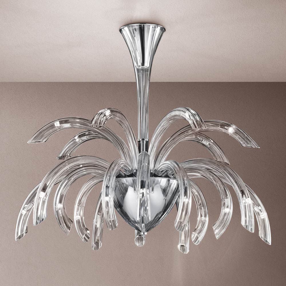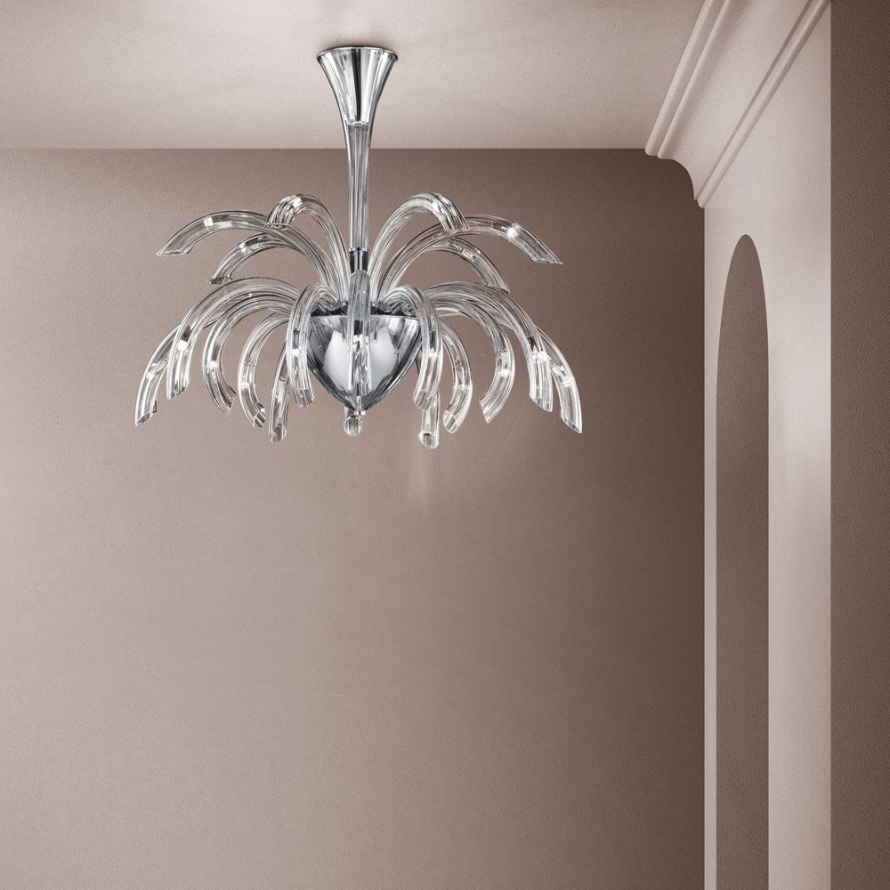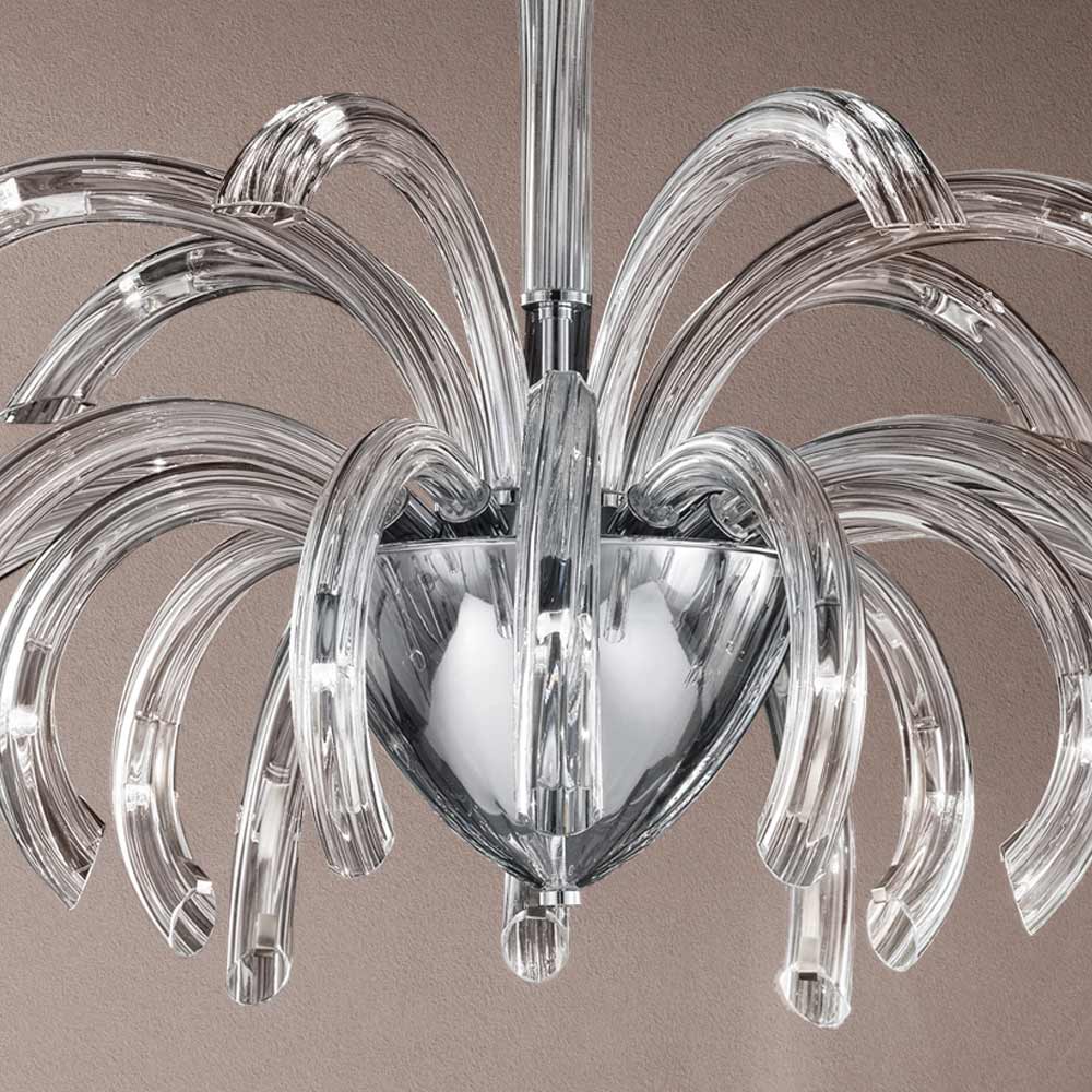 Lysekrone med 21 lys lavet af håndlavet glas af Venedig med krystalfinish og beriget med detaljer i forkromet metal . En engagerende æstetik, der tilpasser sig enhver form for miljø, hvor den passer med overflod takket være dens former og funktionaliteten af dens design. De vidunderlige og elegante buede arme udvider sig udad for at bringe lys i forskellige retninger og oplyse rummet gennem en original scenografisk effekt , der minder om eksplosionen af fyrværkeri for et kreativt , raffineret og stærkt visuelt effektresultat .