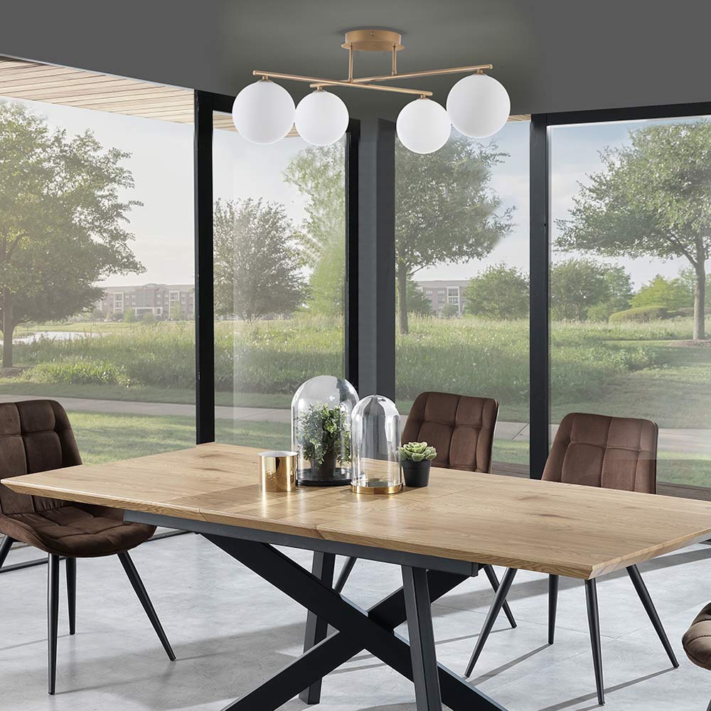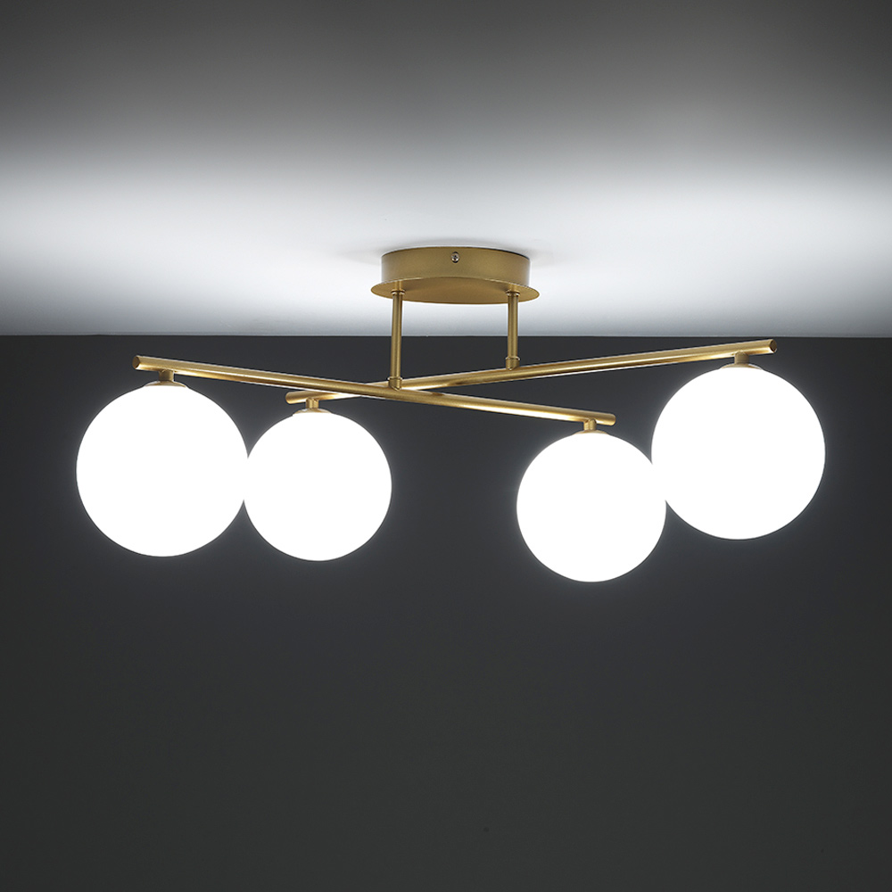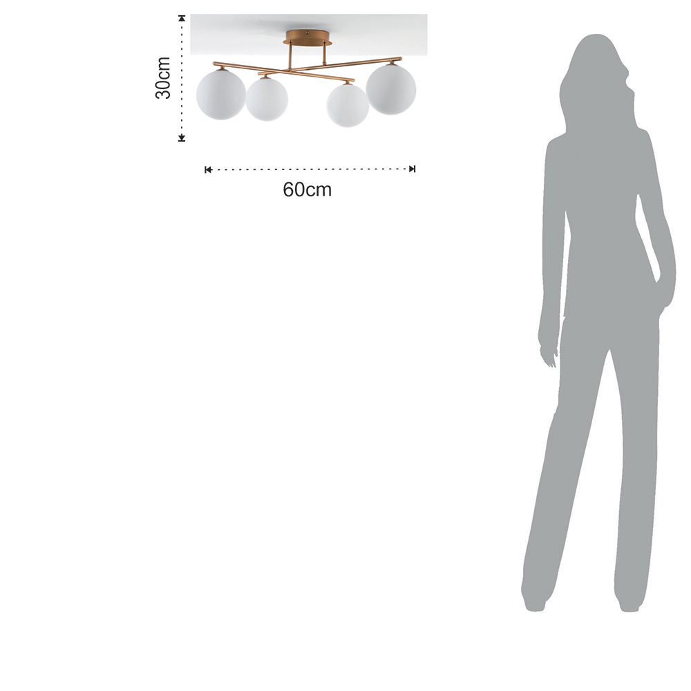 Denne lysekrone repræsenterer et fremragende eksempel på elegant og moderne design , ideel til at tilføje et strejf af stil og raffinement til ethvert miljø. Med fire uigennemsigtige glaskugler ophængt i en metalstruktur, skaber denne lysekrone en diffus og behagelig belysning, perfekt til miljøer som spisestuen, stuen eller endda en entré.