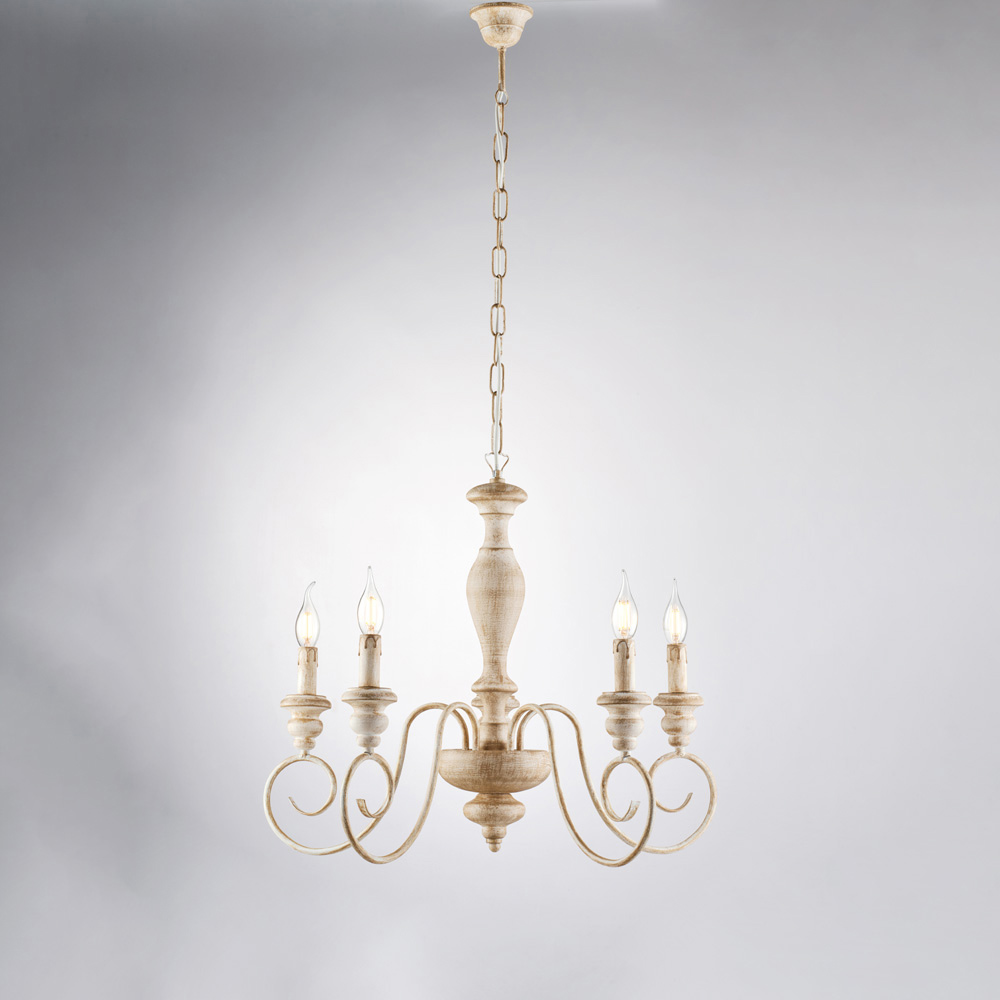 Denne klassiske lysekrone, håndlavet i træ og jern, er elegant og tidløs og en lysende kreation, der udtrykker al charmen ved shabby chic- stilen, genfortolket med et raffineret præg. Den slanke struktur med bugtede arme og stearinlyslignende lys giver rummet lethed og harmoni og skaber en varm og indbydende atmosfære.