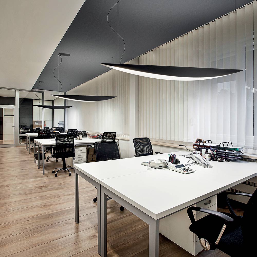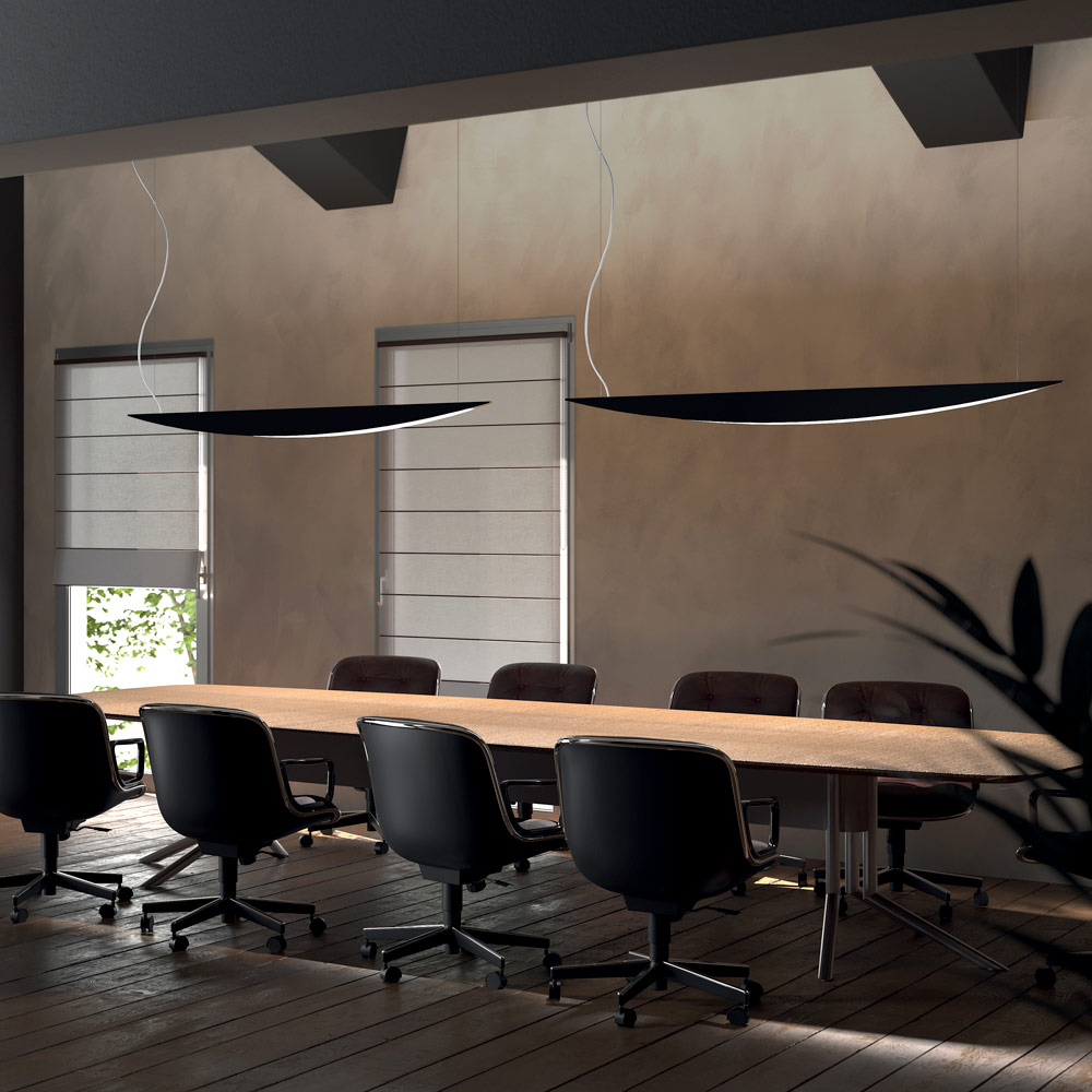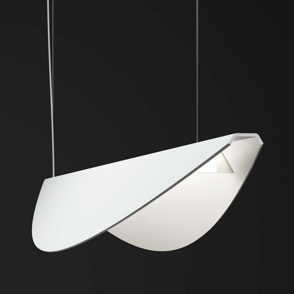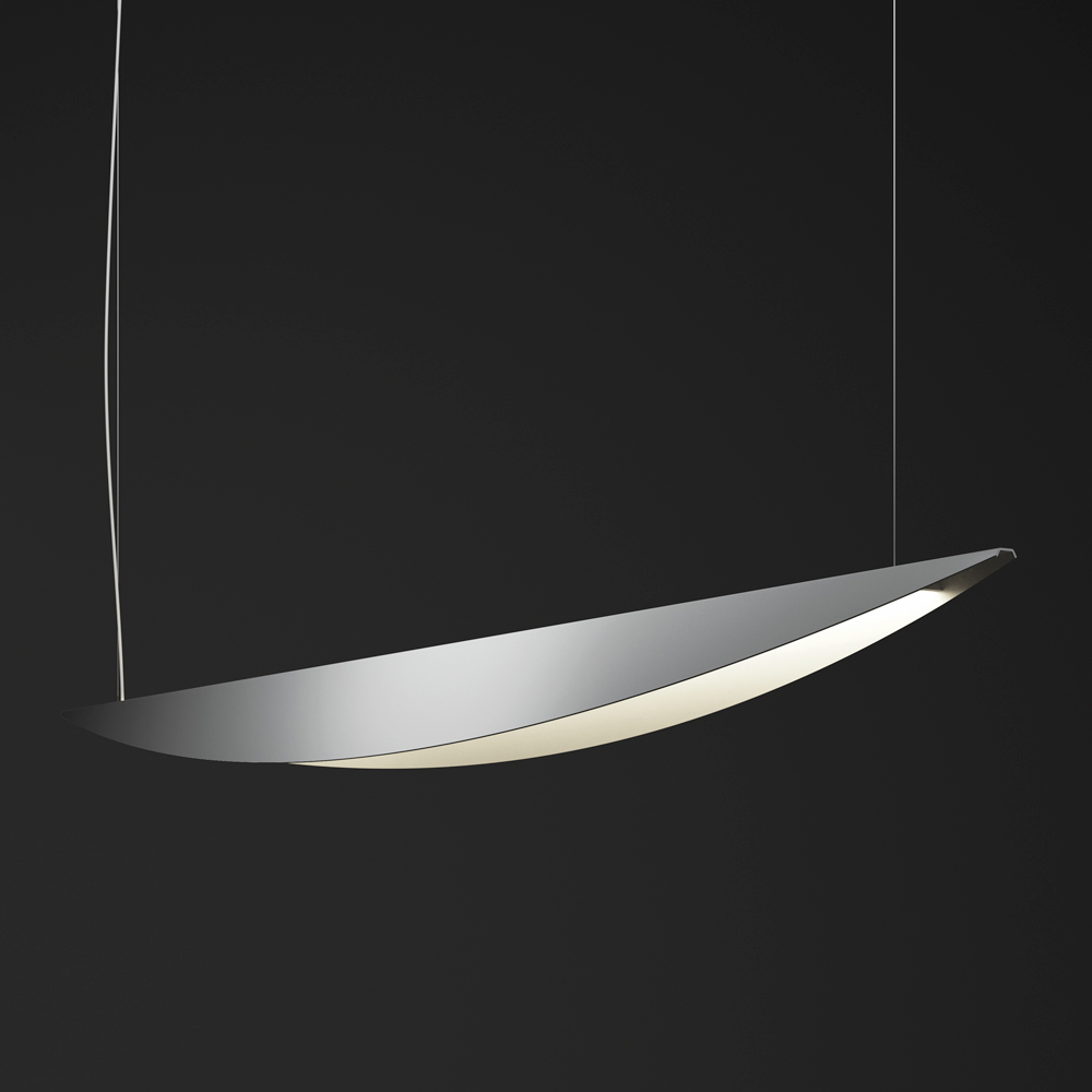 Denne pendellampe er indbegrebet af den perfekte blanding af moderne design og professionel funktionalitet . Dens koniske, slanke og aerodynamiske form fremkalder en vingeprofil, der giver rummet en følelse af lethed og bevægelse .