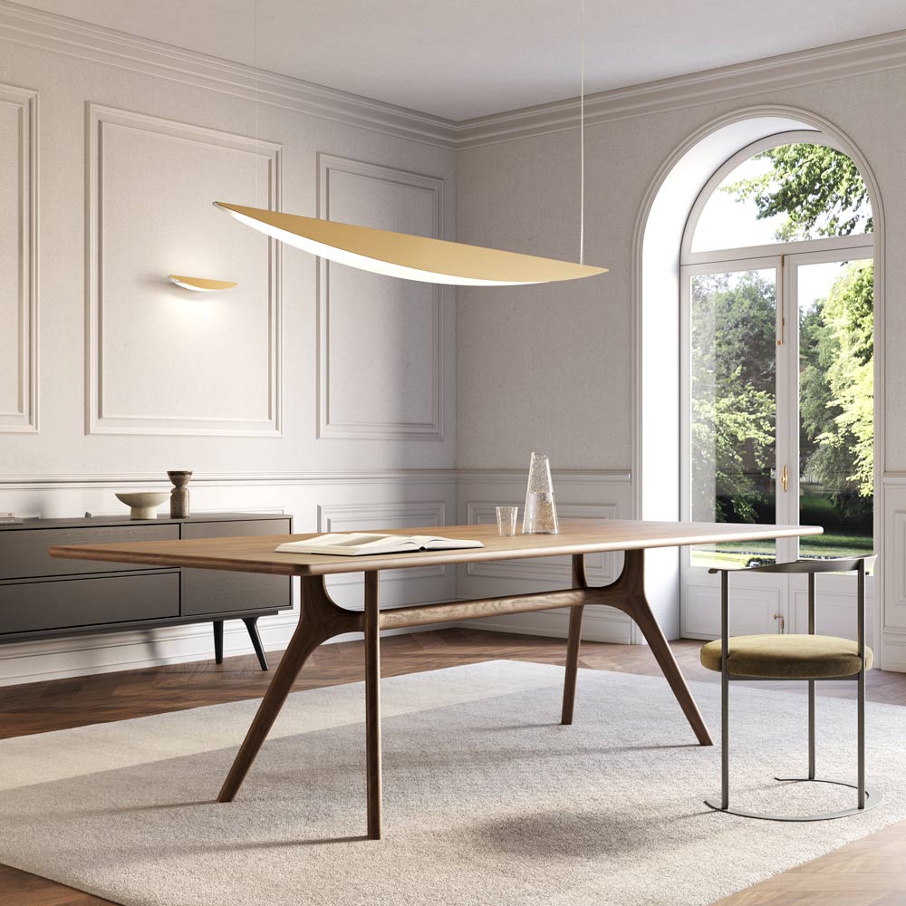 Denne lysekrone er fremstillet af materialer af høj kvalitet og kombinerer rene, skulpturelle linjer med et diffust, jævnt lys , perfekt til at skabe en fokuseret og behagelig atmosfære . Belysningen forbedrer rummet uden at blænde og tilbyder en perfekt balance mellem æstetik og funktionalitet .