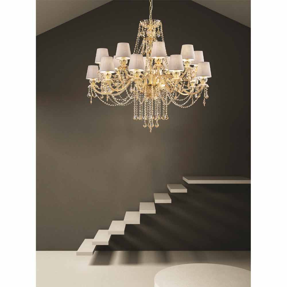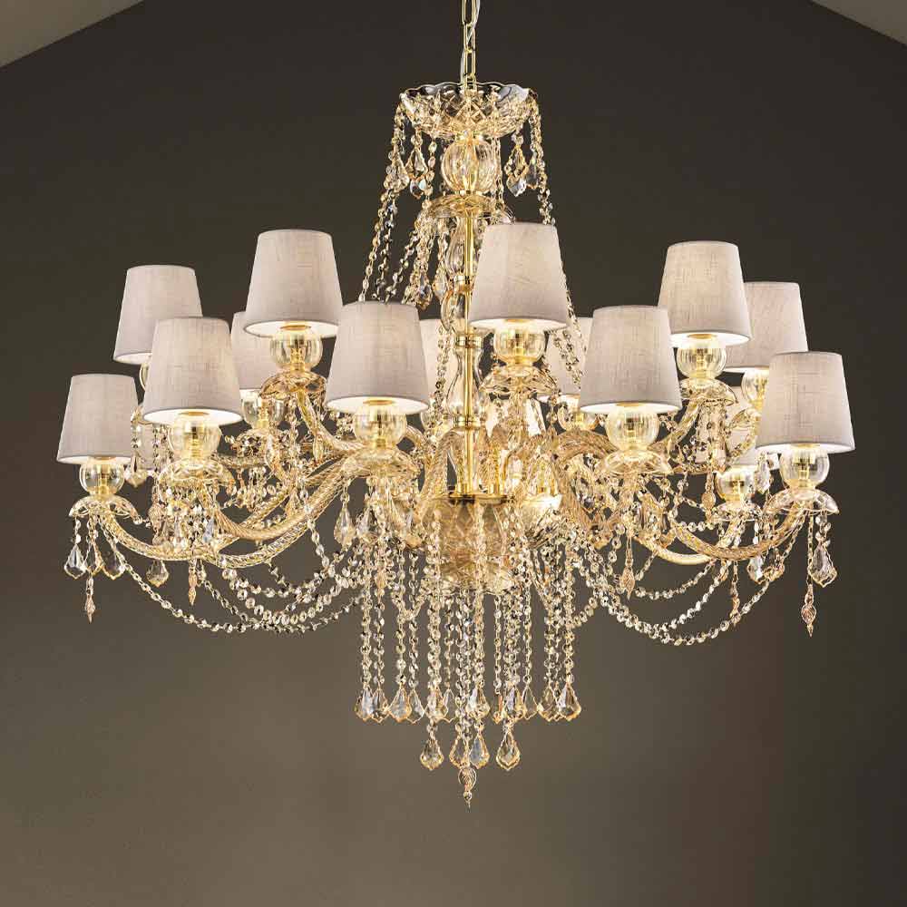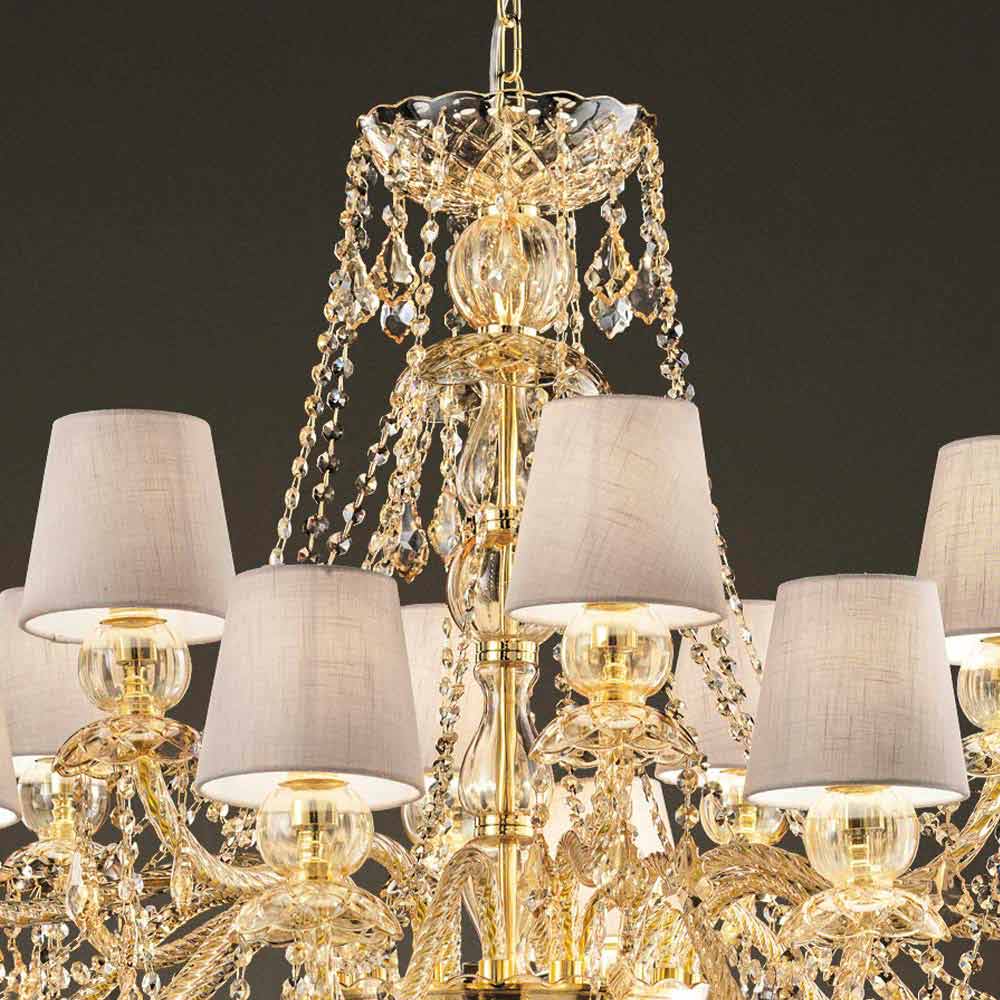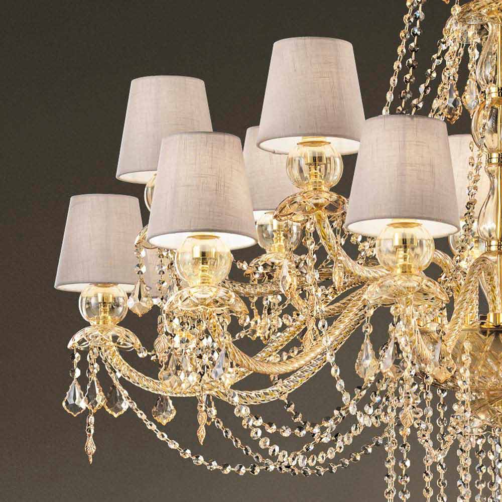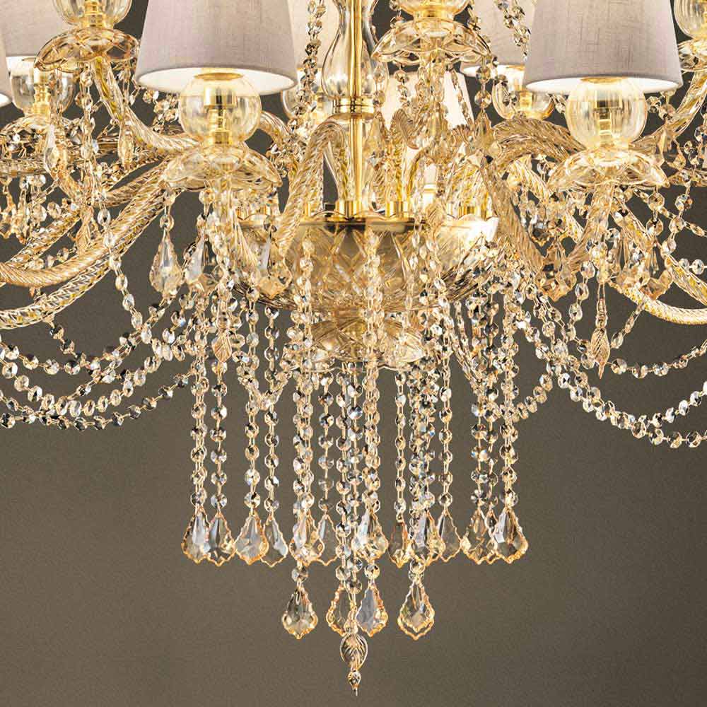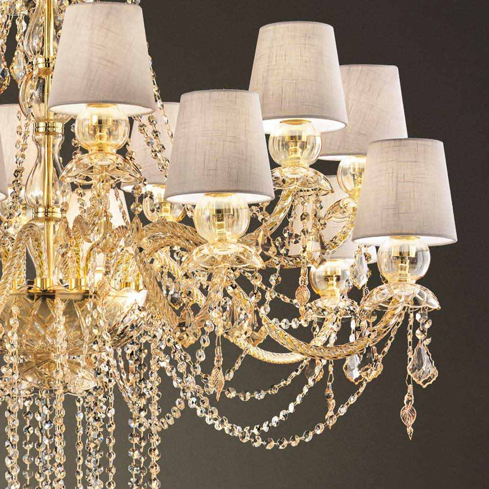 Raffineret lysekrone med ravfarvet Venedig-glasstruktur beriget med elementer i krystalfinish, 16 linnedskærme og skinnende gyldne metaldetaljer , håndlavet i Italien . Lysende vedhæng og fascinerende lampeskærme repræsenterer det særlige ved dette vidunderlige møbleringstilbehør med en romantisk sjæl, der er i stand til at fylde store værelser med personlighed og stil med tidløs elegance . Dens æstetik er gjort unik og interessant af de mange paljetter, der gennem lysbrydning skaber farvede lysstråler og sofistikeret leg af lys og skygge til en lysekrone med en stærk scenografisk indvirkning .