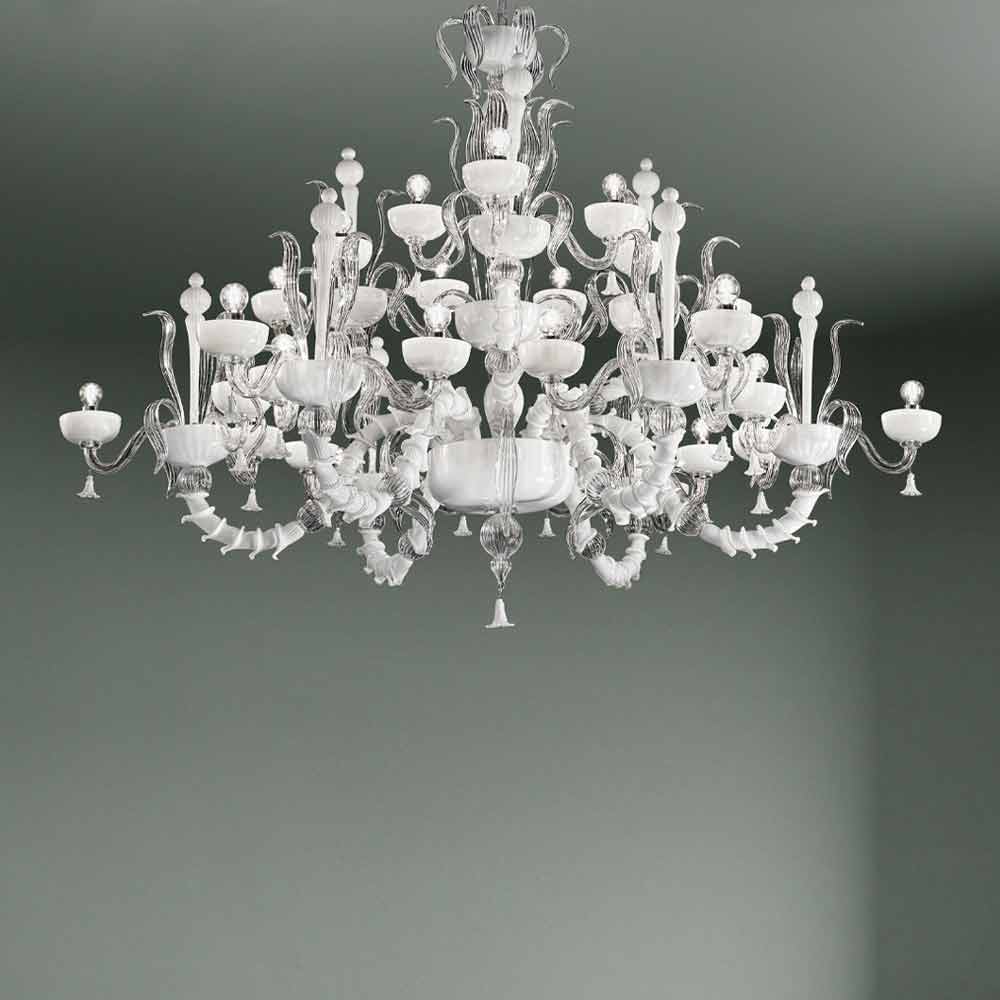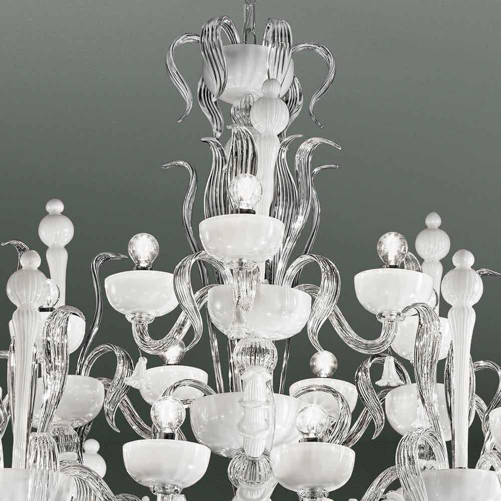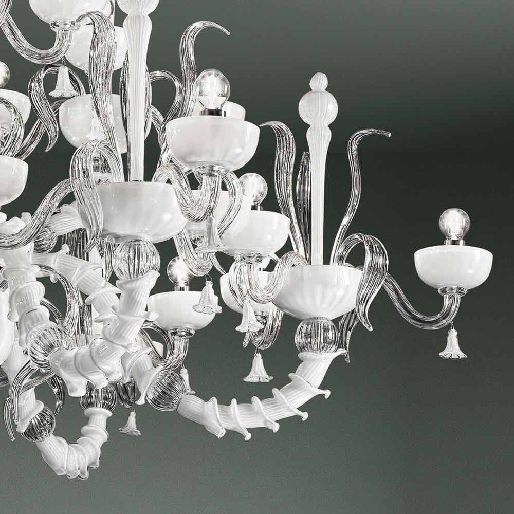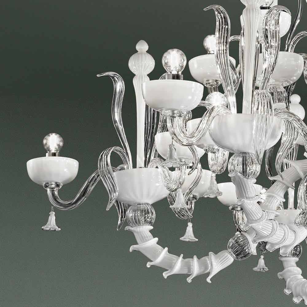 Majestætisk lysekrone med klassiske linjer håndlavet i Venedig i krystal og mælkehvidt glas med detaljer i poleret krommetal . Dette vidunderlige møbel er født af brugen af den gamle belægningsteknik, hvis æstetik er baseret på begreber innovation og samtidig minder om fortiden . Denne lysekrone er ideel til at give store rum i huset lys og skiller sig ud for sin futuristiske æstetik takket være den vidunderlige mælkehvide finish, der dækker strukturen. Designet er også beriget med de tilspidsede arme udsmykket med hængende klokker, der er helt formet i hånden for et resultat af høj kvalitet og uvurderlig værdi .