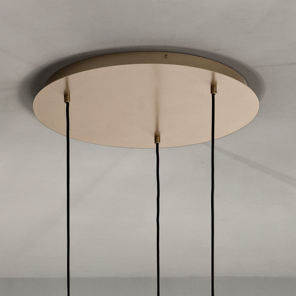 Lysekrone lavet af blæst glas i en sfærisk form med en halvkugleformet linje opdelt i to dele: en gennemsigtig og en farvet. Stel i matsort malet metal og bund i loft i guldmetal . Justerbare kabler med en maksimal længde på 250 cm.