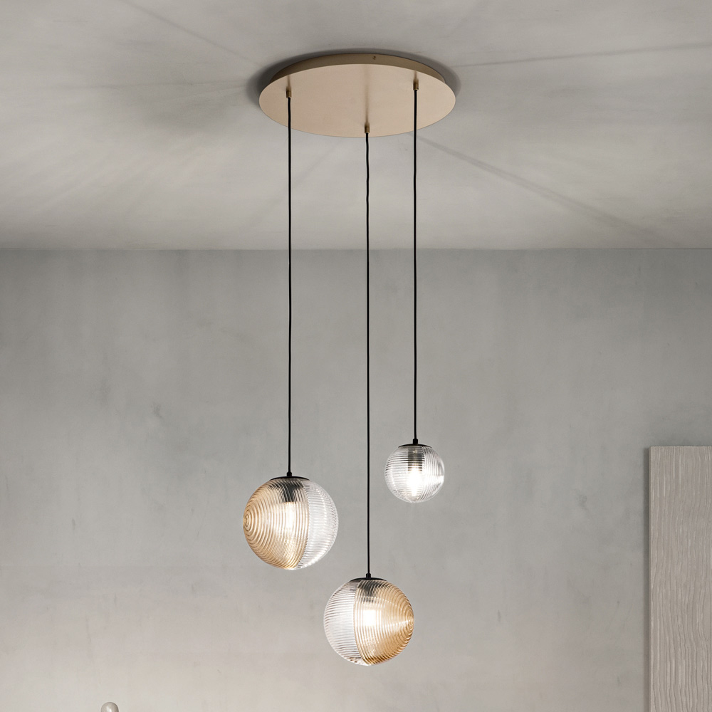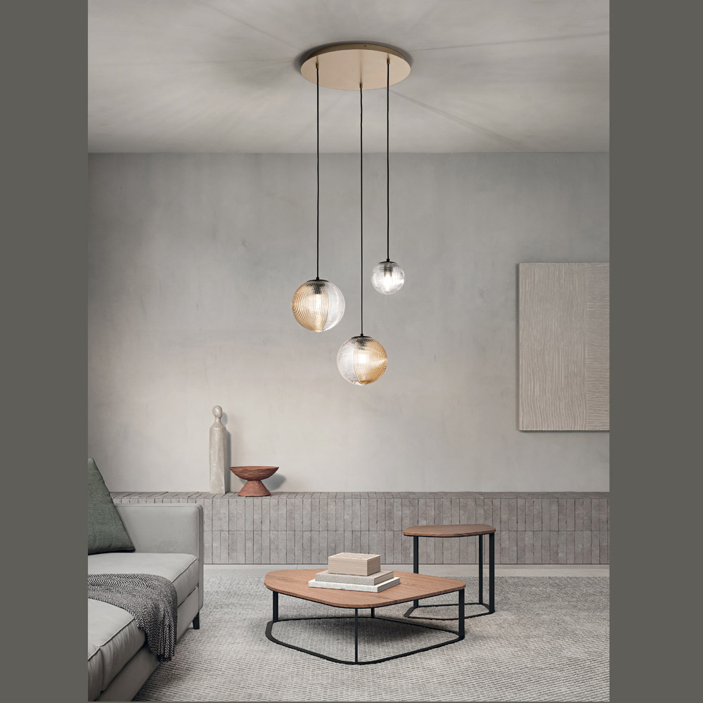Fordyb dig i en atmosfære af moderne elegance med denne vedhængende lysekrone, perfekt til at tilføje et strejf af diskret luksus til ethvert rum. De lysende kugler hænger i en harmonisk dans af lys og refleksioner , hver indkapslet i blæst glas med forskellige finish, der reflekterer et varmt og imødekommende lys .