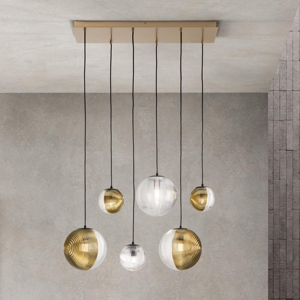 Fordyb dig i en atmosfære af moderne elegance med denne vedhængende lysekrone, perfekt til at tilføje et strejf af diskret luksus til ethvert rum. De lysende kugler hænger i en harmonisk dans af lys og refleksioner , hver indkapslet i blæst glas med forskellige finish, der reflekterer et varmt og imødekommende lys .