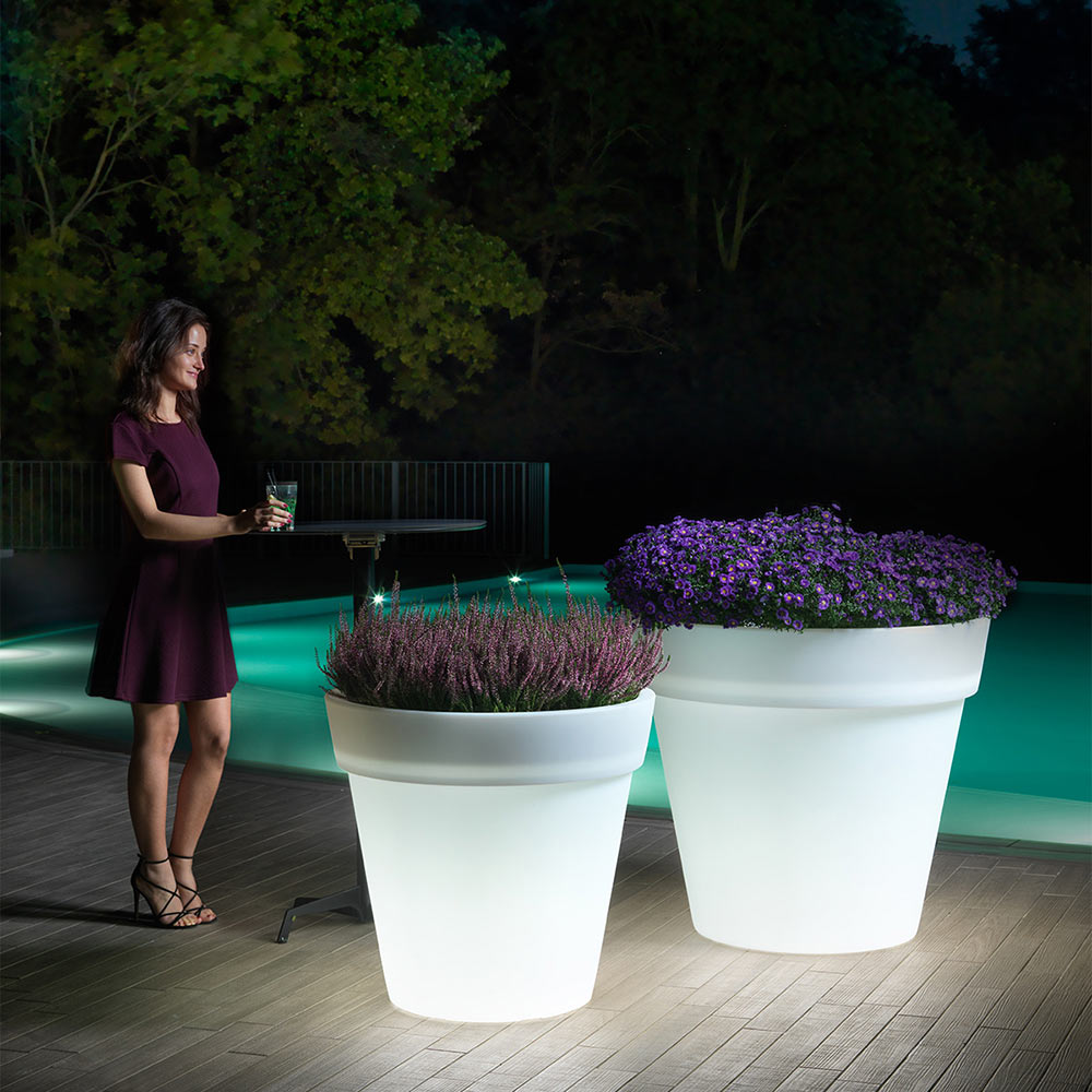 Den lysende udendørs vase i perlepolyethylen fremstillet i Italien fås i forskellige størrelser for at give det udendørs opholdsrum personlighed og drage fordel af dens elegante funktionalitet . Strukturen inkluderer også et vandafløbssæt, som gør denne vase yderst praktisk uden at forsømme det endelige resultat, en strålende atmosfære af elegant og suggestivt lys. Det integrerede LED-lys gør denne udendørs vase til et moderne indretningstilbehør, med bløde linjer, der afspejler en idé om klassisk, men utrolig elegant stil.