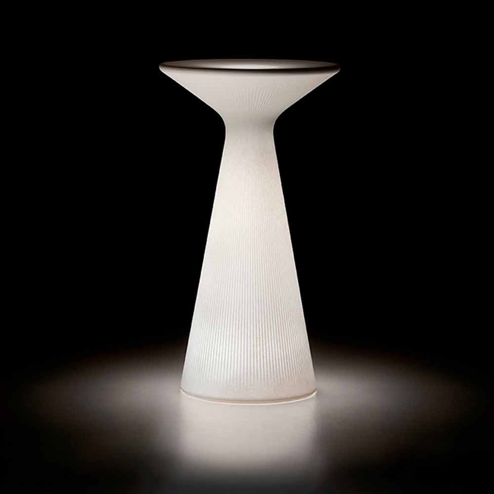 Rundt udendørs sofabord lavet i Italien med hvid polyethylenstruktur , der er kendetegnet ved den specielle stribede overflade, der dækker hele bunden og skaber originale leg- og skyggespil. Sammen med denne funktion er det, der gør designet af dette produkt unikt og særligt interessant, RGB LED-lyset, der skaber moderne og fængslende atmosfære, der er ideel til dejlige aftener med venner i indenlandske udendørs rum som haver eller terrasser, men også kontraktsmiljøer, hvor indretning en unik og kreativ måde uden at forsømme produktets grundlæggende funktionelle aspekt.