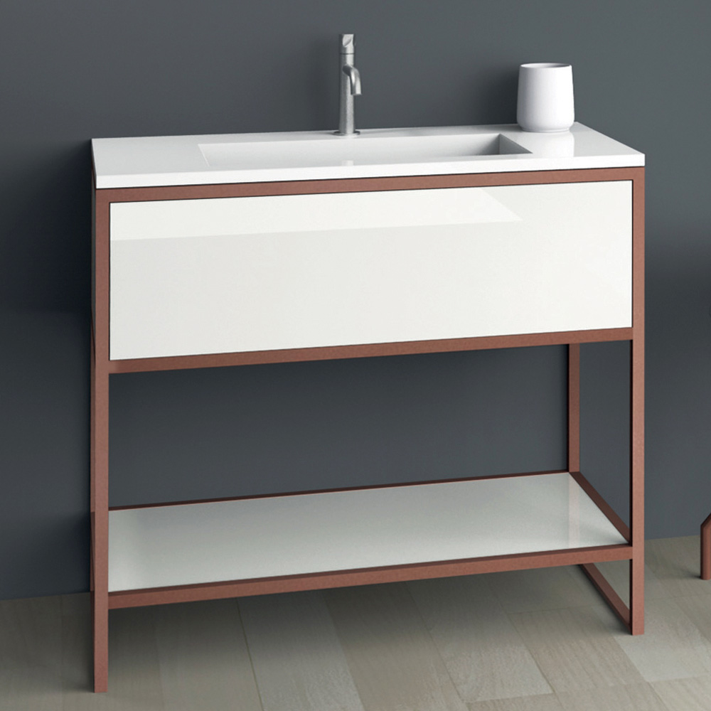 badeværelsesmøbler er kendetegnet ved en struktur lavet med en tynd kobberlakeret metalprofil, der indrammer dørene og hylden i blank hvidlakeret mdf, hvilket skaber en harmonisk kombination af fuld og tomme rum. Dørens metalfinish fremhæver den elegante kompositions