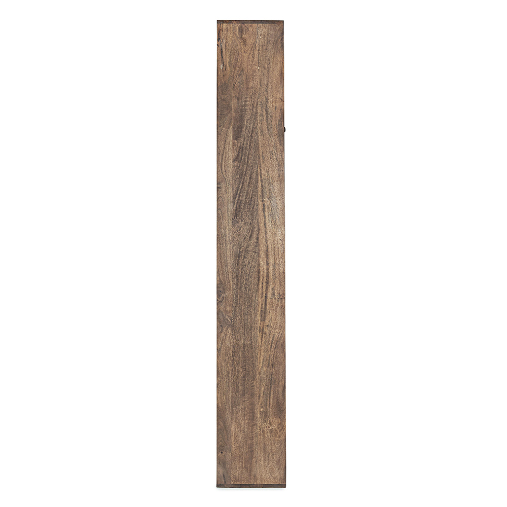 Denne bogreol i stuen har en struktur i mangotræ med MDF-bagside.