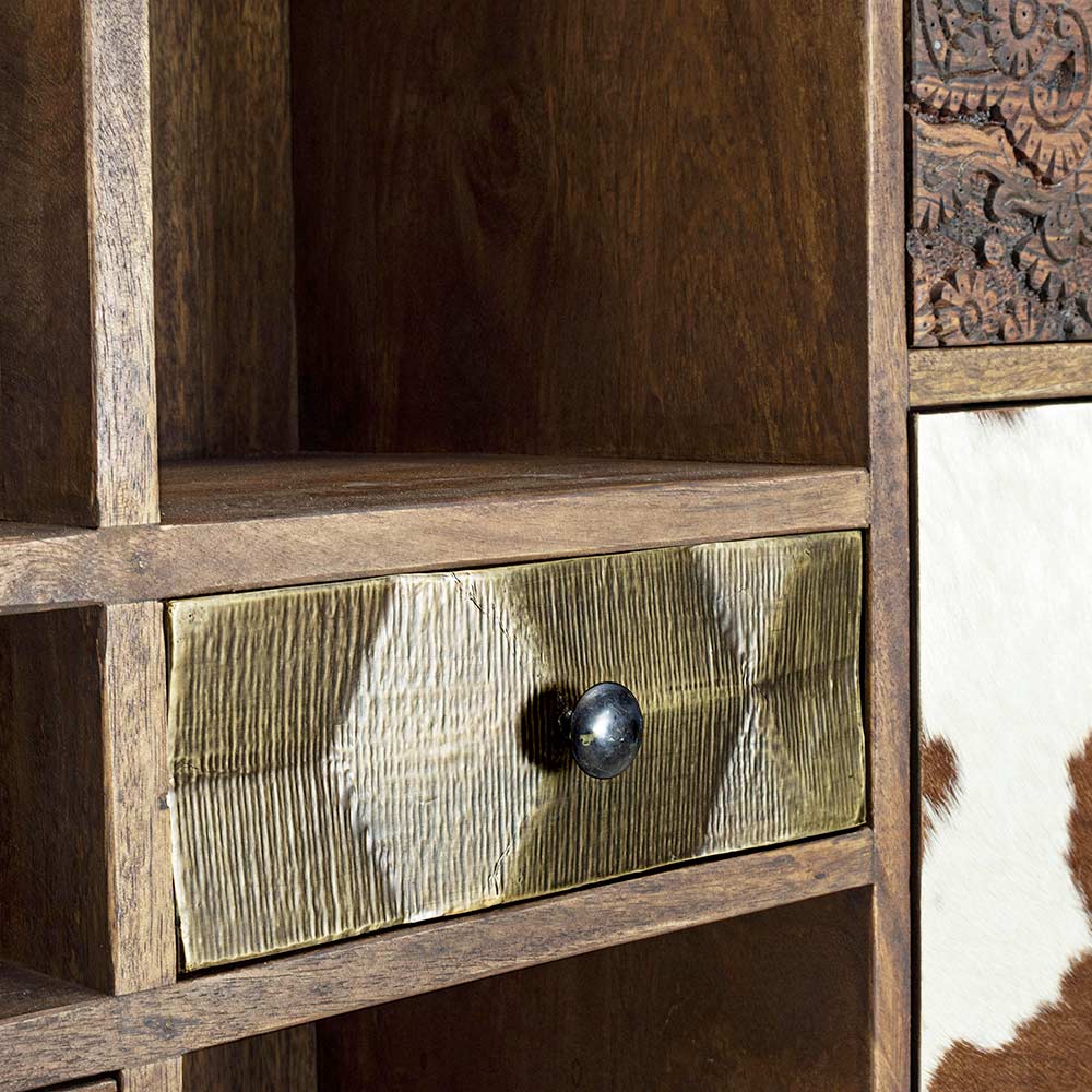 Forsiden af dørene er lavet af genbrugt mango- og akacietræ med metal- og læderapplikationer.