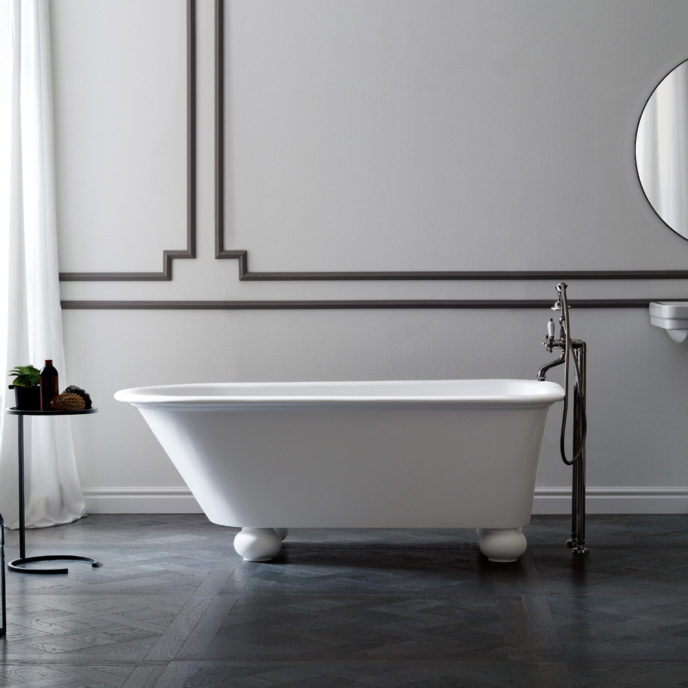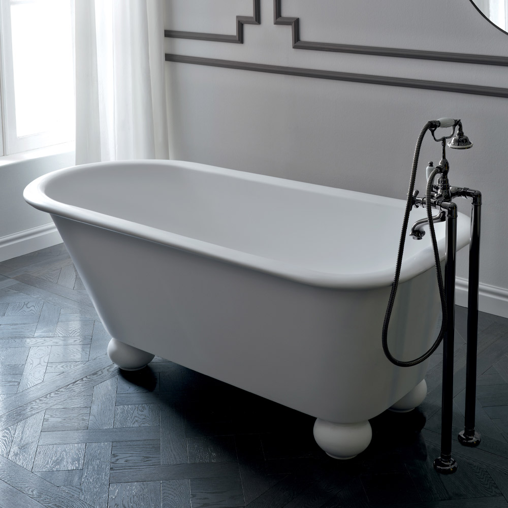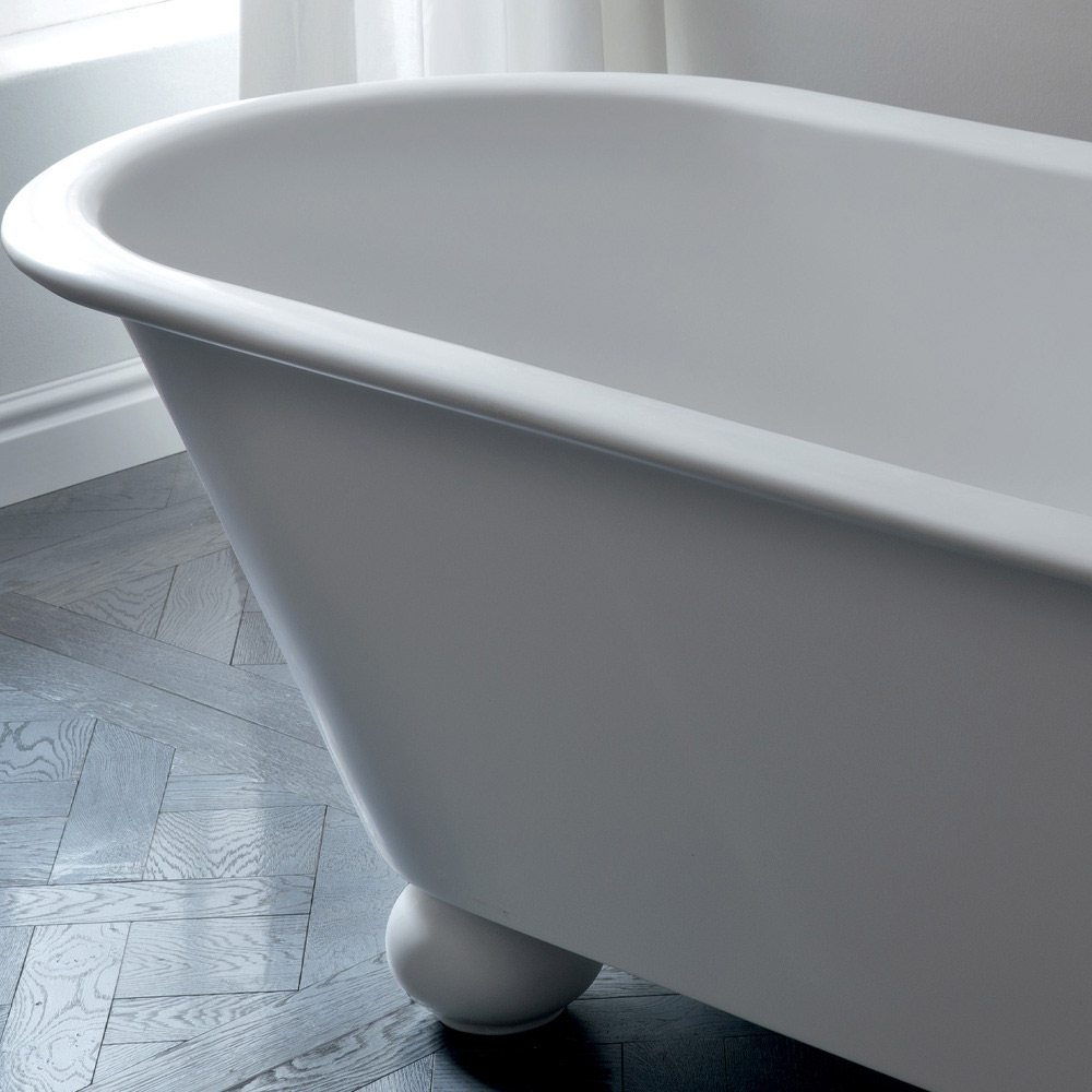 Hvidt badekar i Solid Surface , en blanding af akrylharpiks modificeret med mineralske forbindelser i en uigennemsigtig hvid farve. Badekar dedikeret til elskere af det traditionelle clawfoot badekar. Sammensætningsblandingen tillader denne karakteristiske farve at komme ud. Denne blanding er også meget fornyelig, homogen og 100 % ikke-porøs og derfor vandtæt.