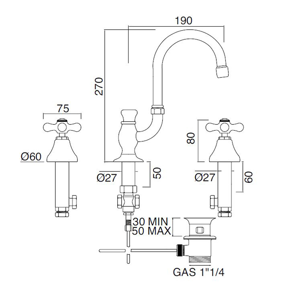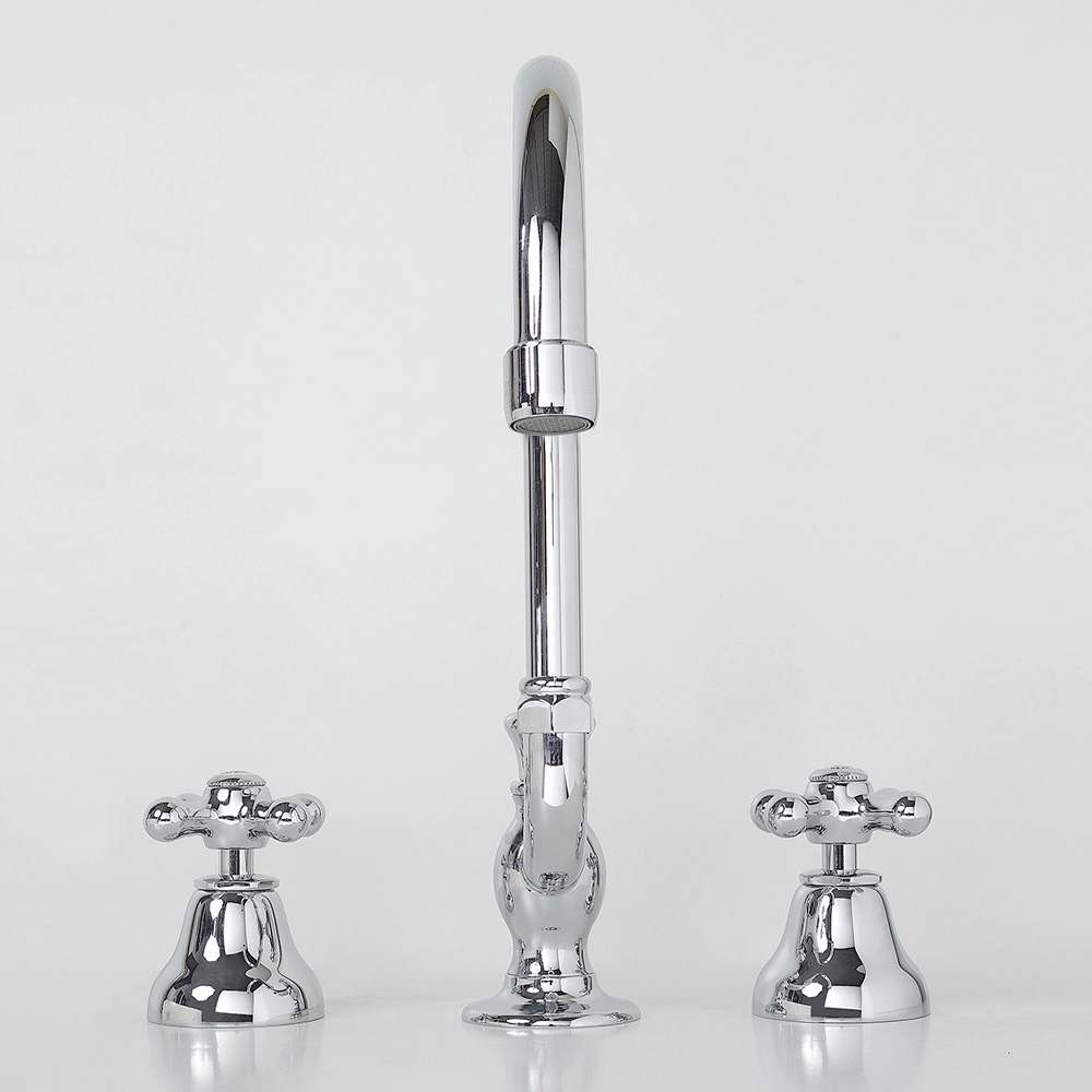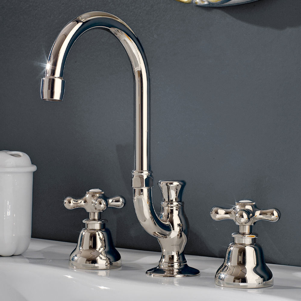 3-huls håndvaskarmatur med høj tud og messingafløb, høj kvalitet fremstillet i Italien.