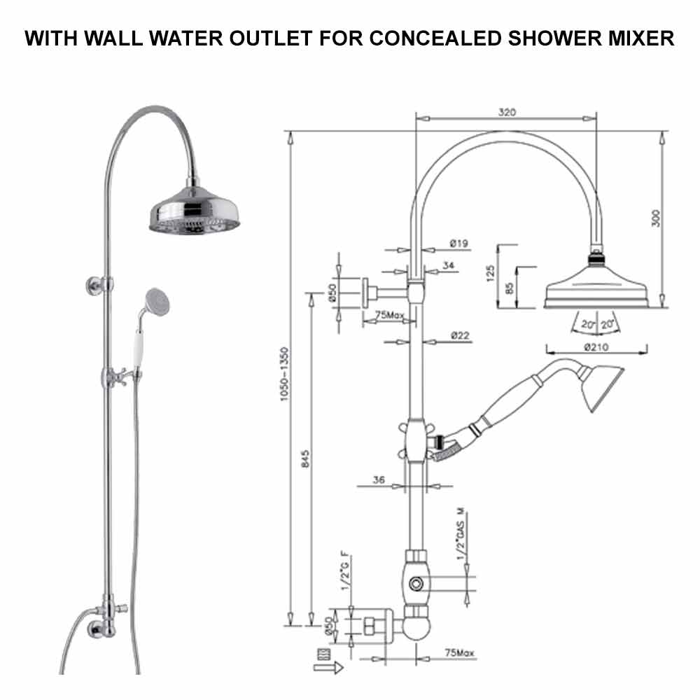 Brusesøjle af messing med rundt brusehoved og antik håndbruser Made in Italy.