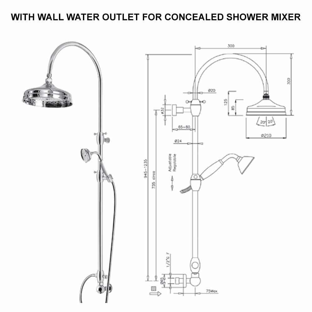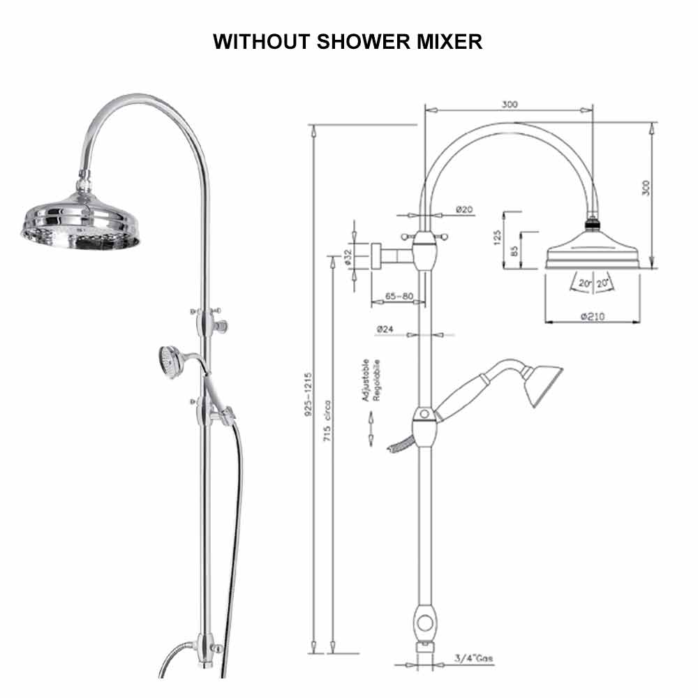 Brusesøjle af messing med klassisk design brusehoved og håndbruser, høj kvalitet Made in Italy.