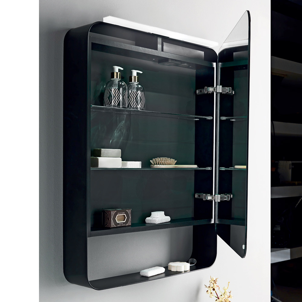 Den enkelte dør åbnes for at afsløre en praktisk opbevaringsplads, perfekt til at holde dine skønheds- og plejebehov ryddelige og let tilgængelige. LED-lyset giver optimal belysning, essentiel for daglige skønhedsrutiner, samtidig med at den tilføjer et moderne touch.
