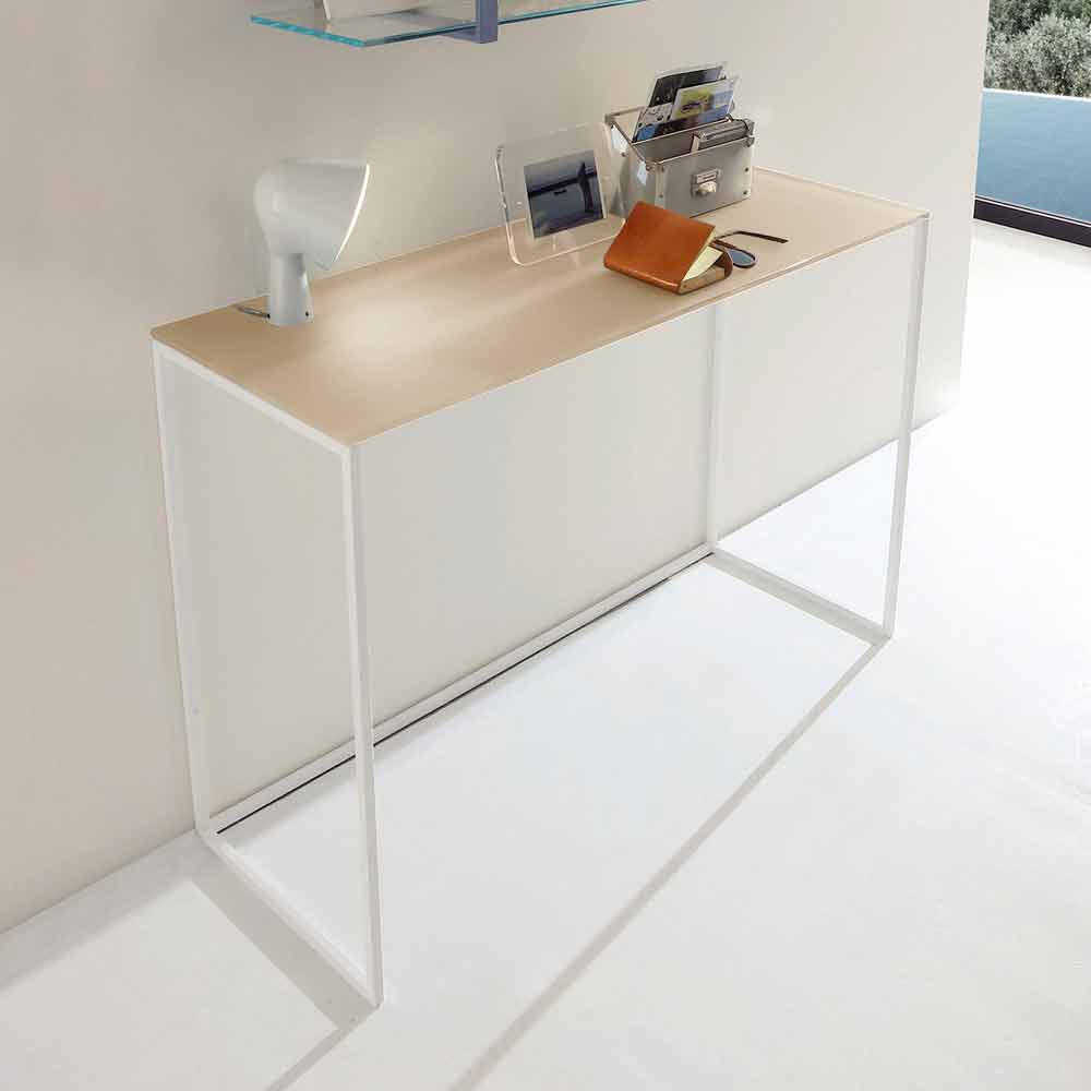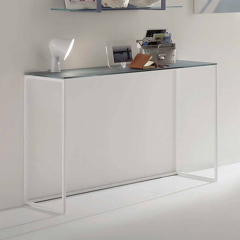 Moderne konsol fremstillet i Italien med glasplade og hvidmalet metalstruktur . En enkel og alsidig møbleløsning, der er i stand til at karakterisere ethvert rum ved at give et strejf af stil til det omgivende miljø. Dens væsentlige linjer gør det muligt at spille rollen som en praktisk støtteflade i forskellige områder af huset, såsom indgangen eller stuen, hvilket samtidig viser sig at være et perfekt dekorativt element, der er i stand til at fuldføre møblerne. Takket være valget kombinerer du metalens ubestridte modernitet med krystalens tidløse elegance og dens vidunderlige finish, og det endelige resultat giver en innovativ og original idé, der er i stand til at gøre hvert værelse unikt, omend i sin ekstreme enkelhed.