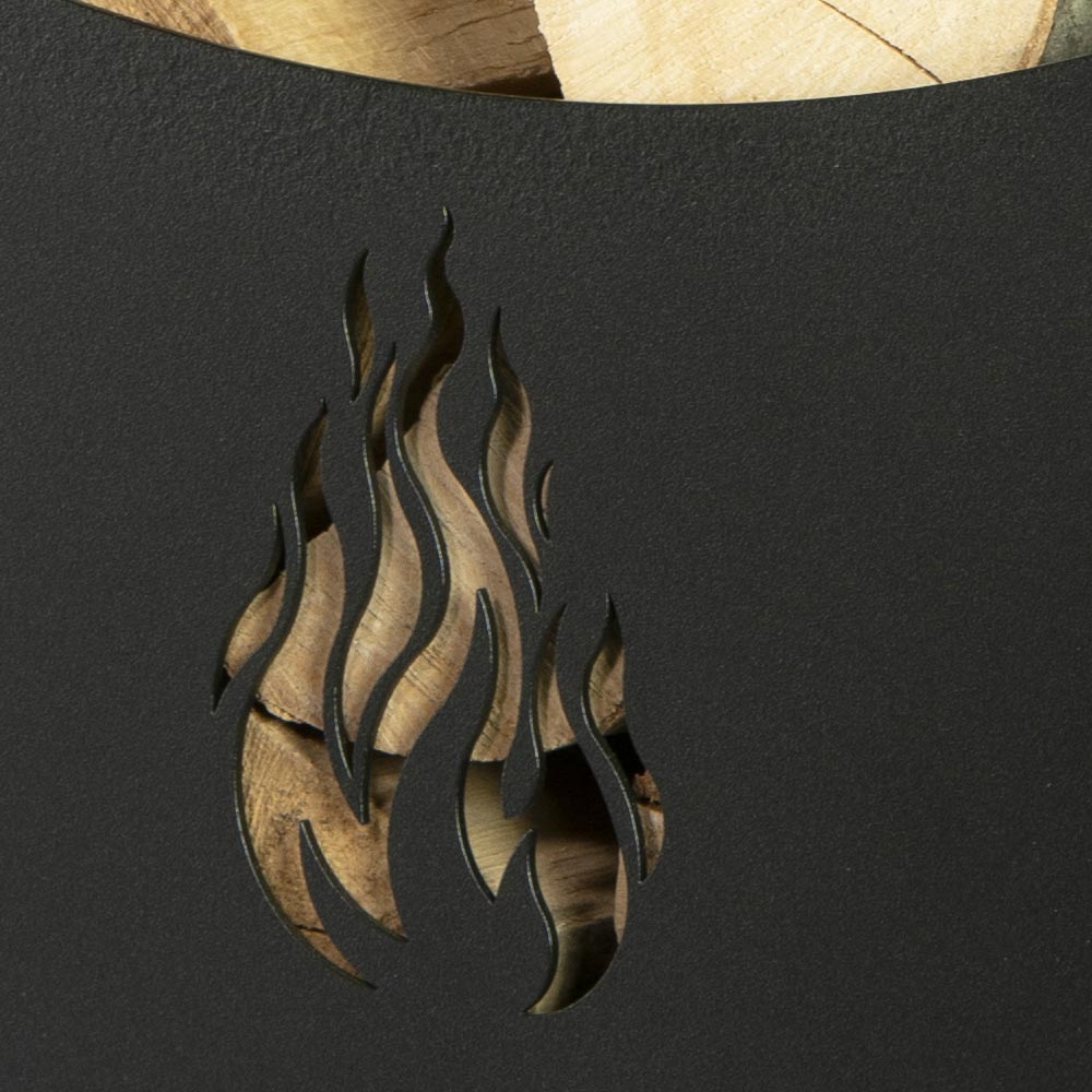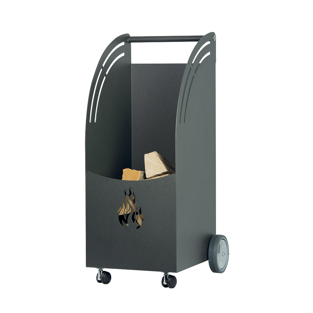 Den robuste metalkonstruktion garanterer holdbarhed og stabilitet , mens de modstandsdygtige og lethåndterlige hjul giver dig mulighed for nemt at flytte vognen overalt i huset, fra trælageret til pejsen. Flammeudskæringen på fronten er ikke kun en dekorativ detalje, der fremkalder ildens varme og komfort, men tjener også til at ventilere og holde træet tørt.