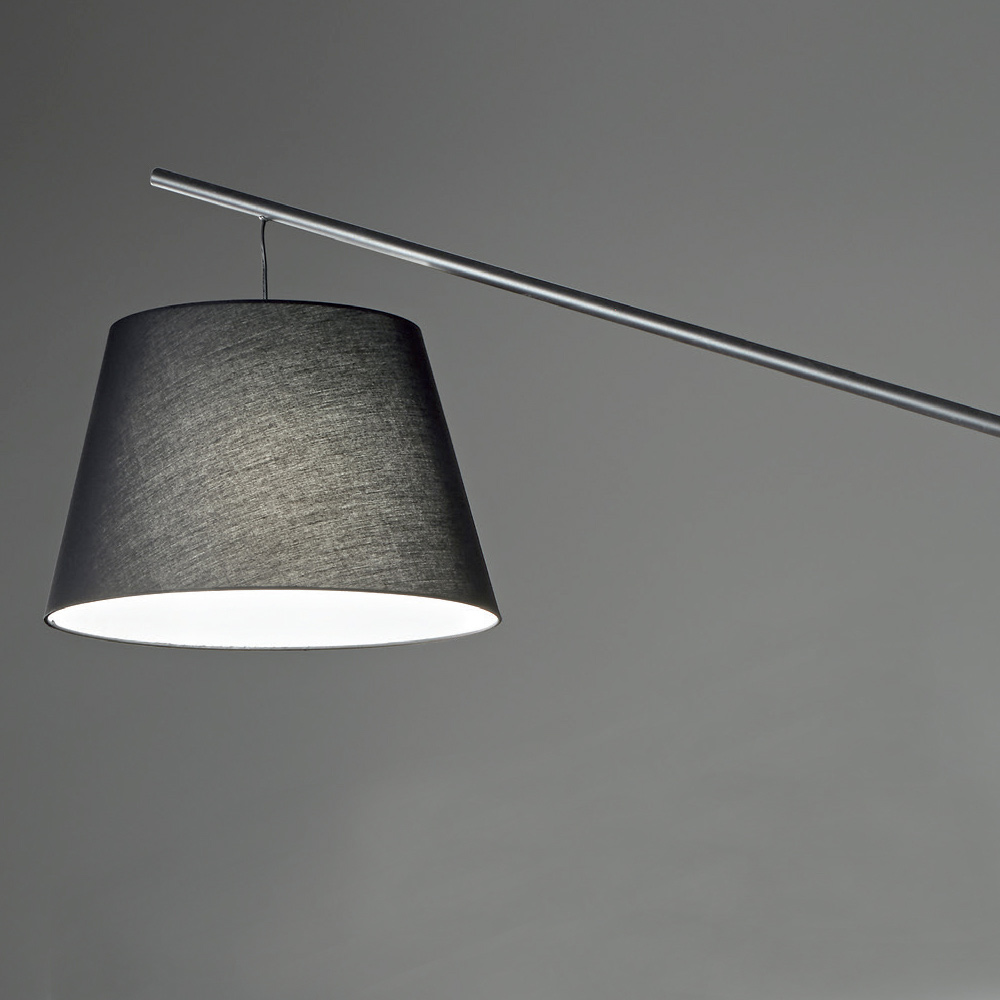 Metalgulvlampe med stofbeklædt lampeskærm.