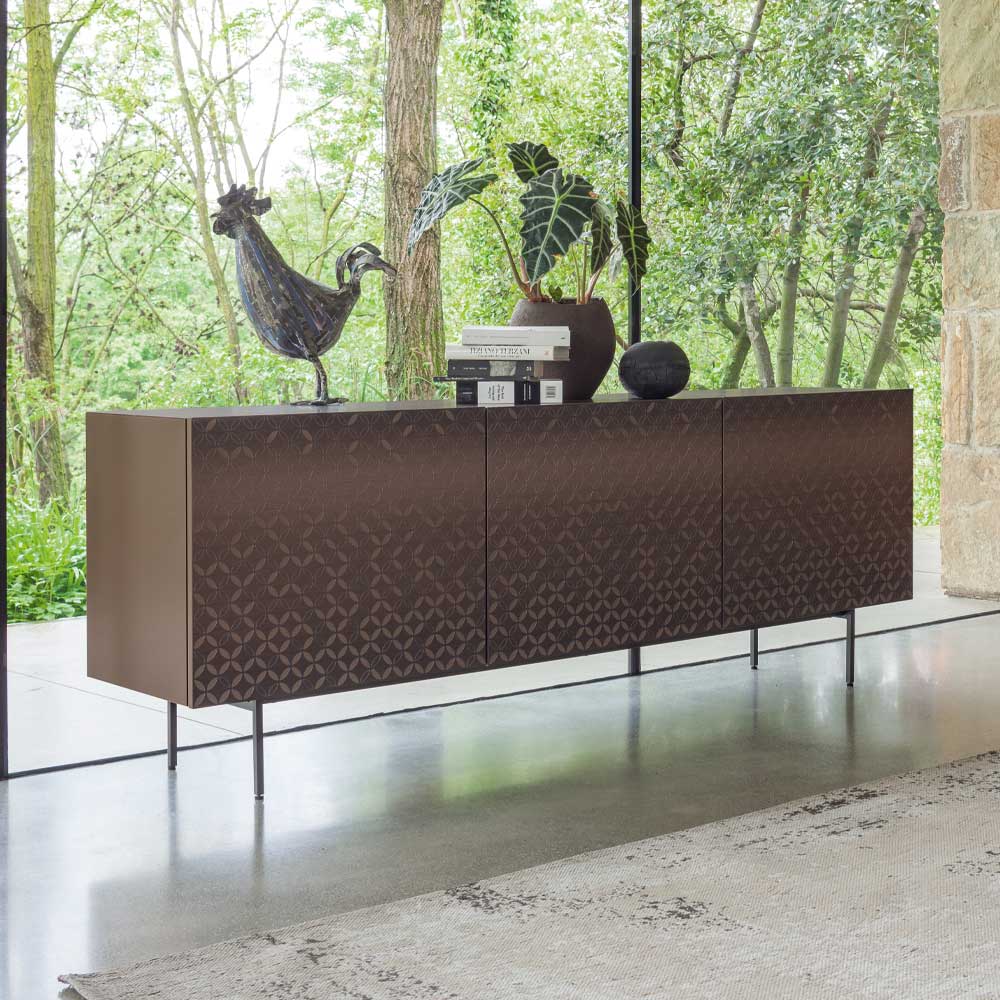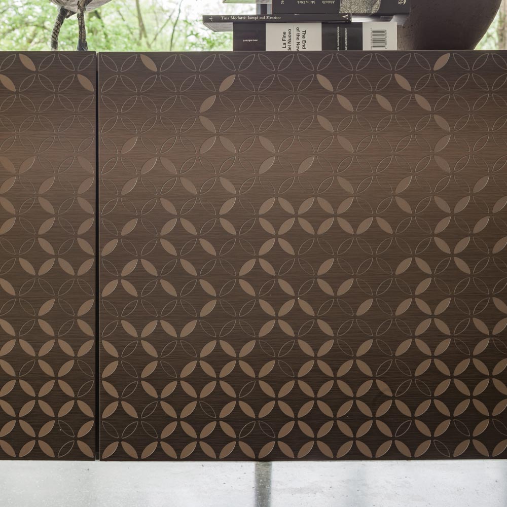 Made in Italy. Fusion af elegance og funktionalitet, der fremhæver skønheden i moderne miljøer. Defineret af udsmykningen af dens døre, som beriger møblerne med kvalitetsdetaljer, der ligner delikat broderi. Hvert rum i skænken er udstyret med to rummelige indvendige hylder, hvilket sikrer praktisk funktionalitet. Effekten af elegance accentueres af indsatsen, der kendetegner dørene, en detalje, der tilføjer et strejf af raffinement og modernitet til designet.
