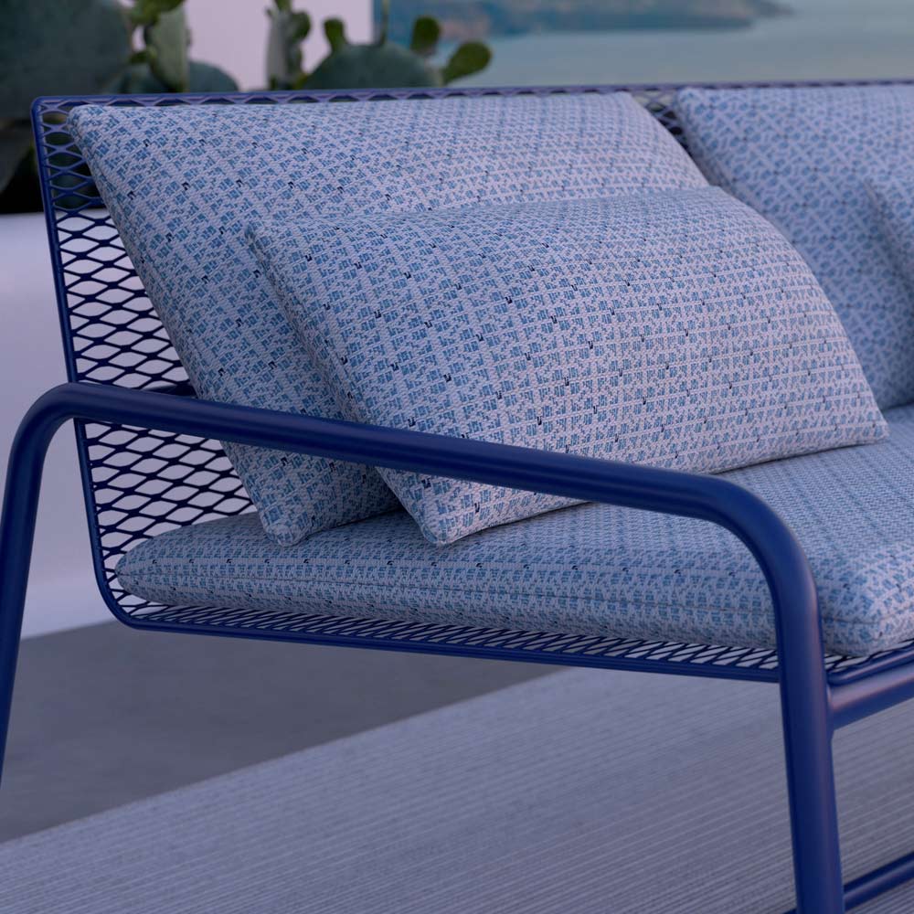 Udendørssofa i metal med koordinerede stofpuder fås i forskellige finish, luksusartikler lavet i Italien.
