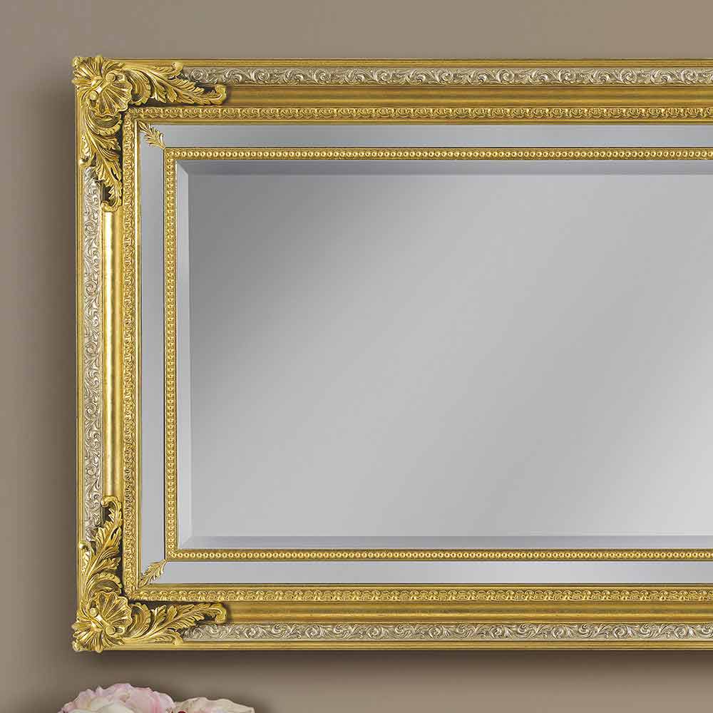 Dette elegante spejl er et lysende eksempel på skønhed og håndværk. Stellet er en triumf af klassisk design, beriget med indviklede detaljer og friser, der fanger barokkens lys og charme. Hvert hjørne er udsmykket med blomsterdekorationer og overdådige motiver, der blander sig i en ramme af ren storslåethed.