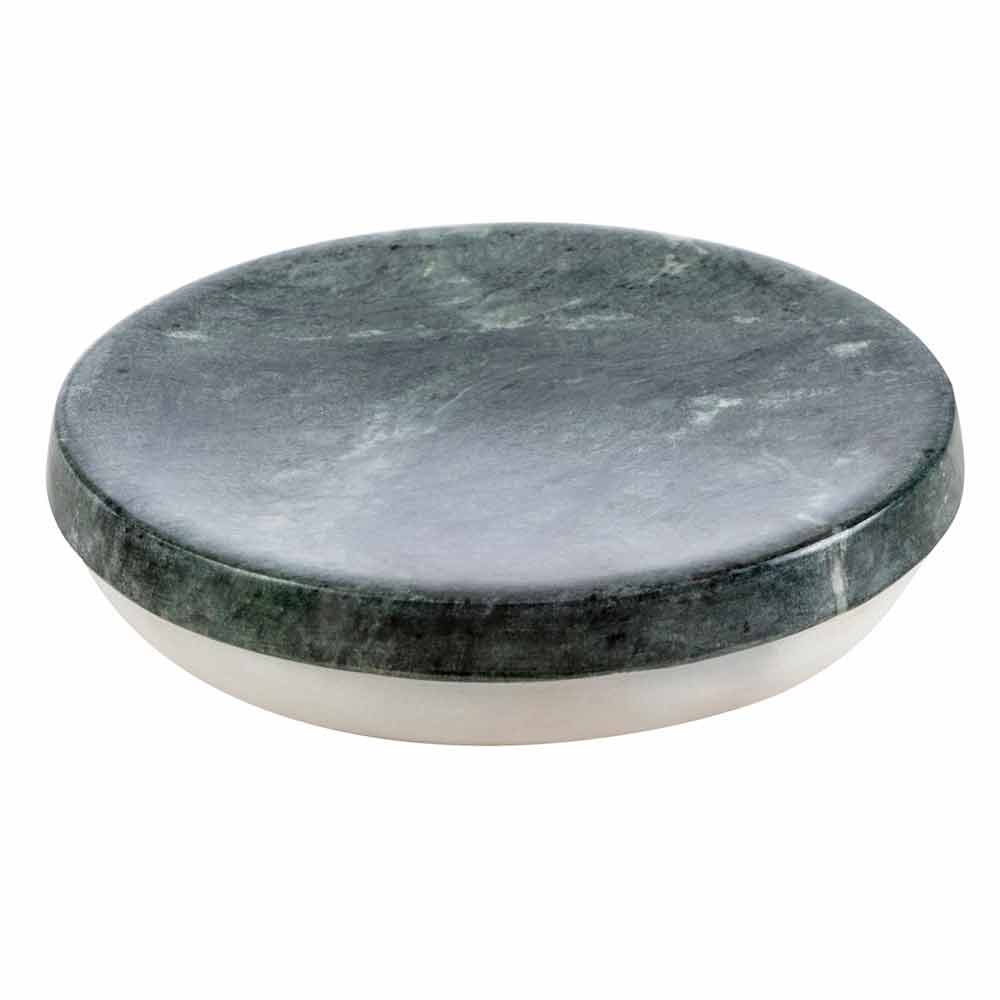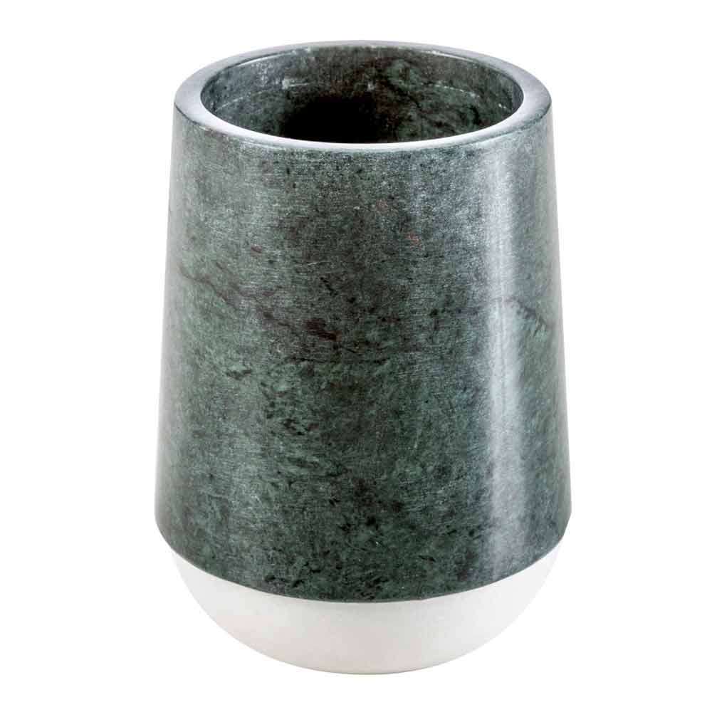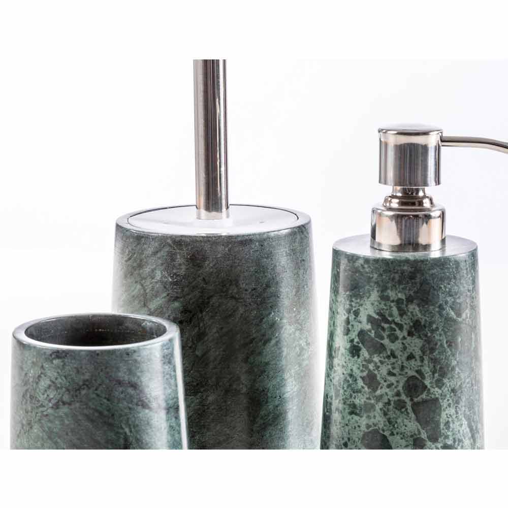 Bombei er badeværelsestilbehørssættet lavet af broget grøn marmor rig på årer, der hviler på en Calacatta marmor base.