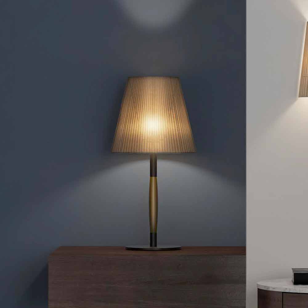 Bordlampe i metal og træ med moderne organza lampeskærm Made in Italy.